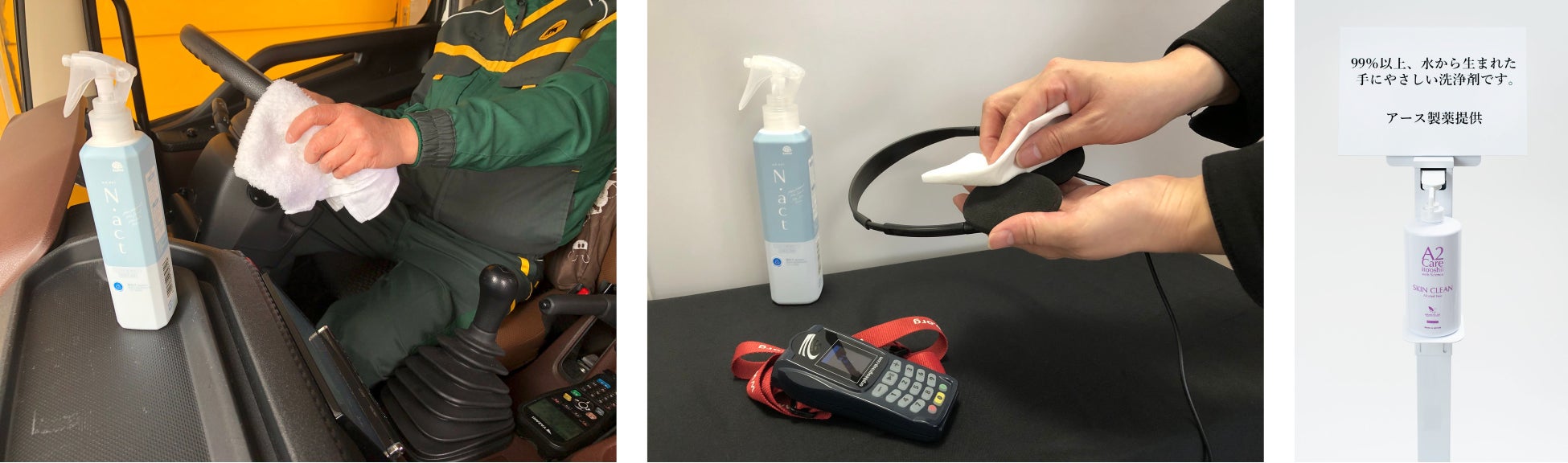 ドライバーの手肌は「A2Care」スキンクリーンでの洗浄や、トラック内でのハンドル、椅子には「N.act」 除菌・消臭スプレーで除菌します。