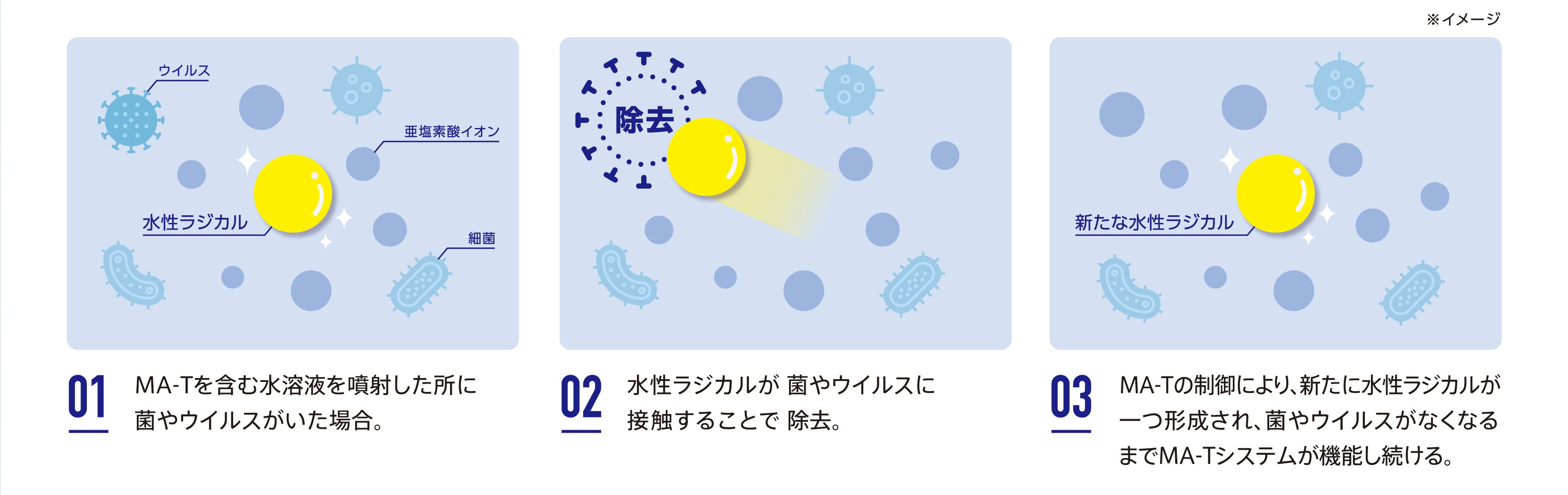 革新的な酸化制御技術「MA-T(エムエーティー) システム®」(※3)は、亜塩素酸イオンから、反応すべきウイルスや菌が存在するときにのみ、 必要なときに必要な量の活性種(水性ラジカル(※4))を生成させることで、さまざまなウイルスの不活化、種々の菌(細菌)の除去(※5)を可能にします。99.9%以上が水 であるため、既存の除菌剤である塩素系消毒剤や高濃度アルコールと比較して安全性が高く、ノンアルコールでキッチン周りでも安心して使える利点があります。