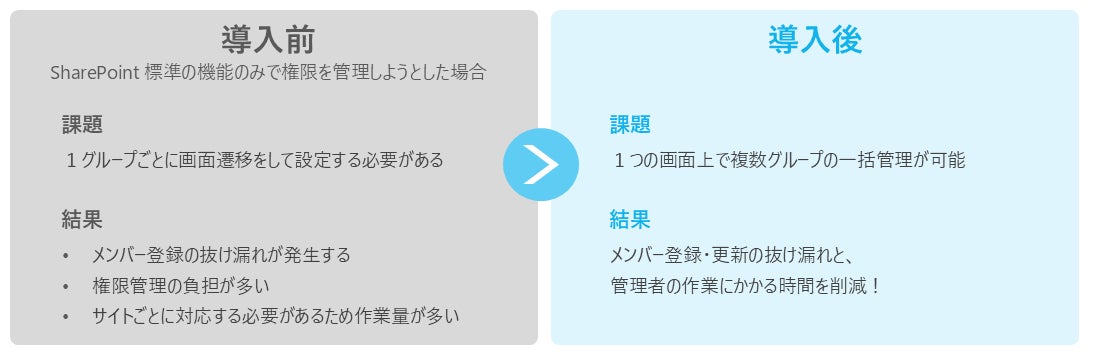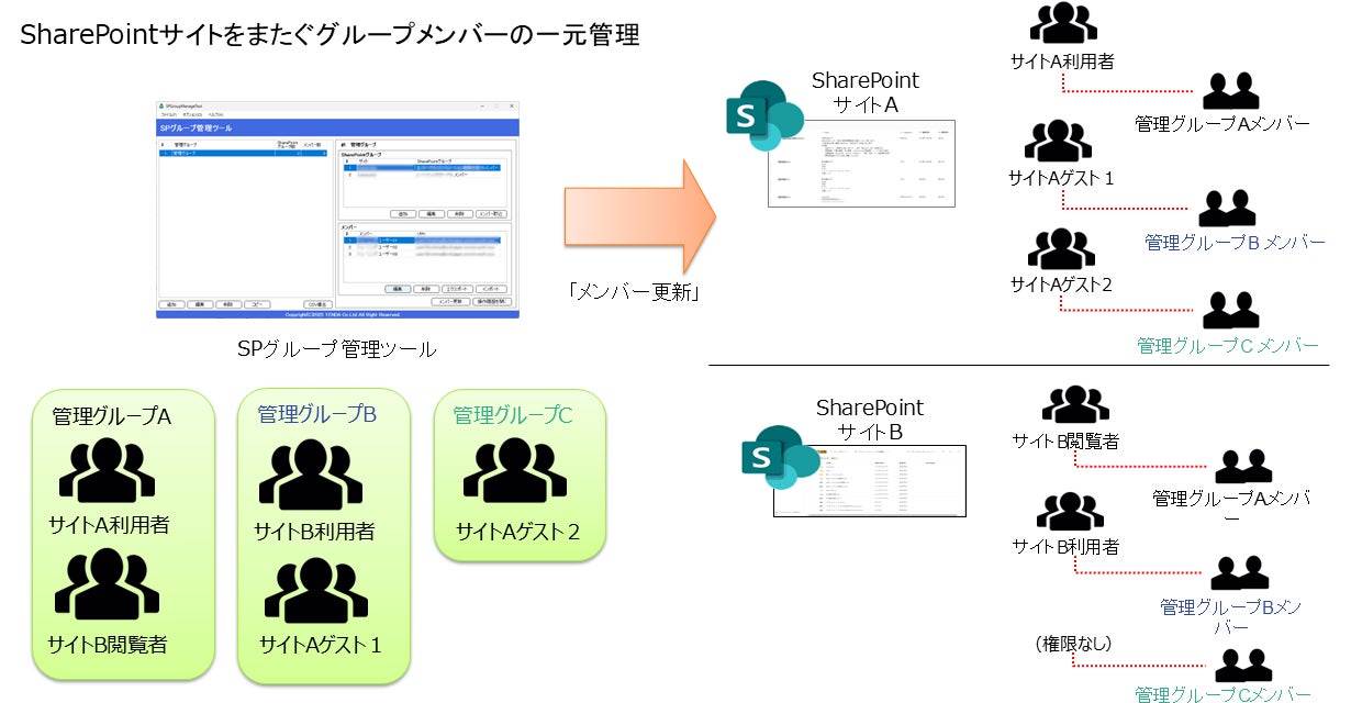 異なるSharePointサイト間でも、管理グループを通じて共通のユーザーを一括で登録・更新することが可能です。また、サイトごとに必要なアクセス権が異なる場合でも、ユーザーの管理を一元化し、必要な権限を付与できます。これにより、セキュリティと利便性を両立した運用が可能になります。