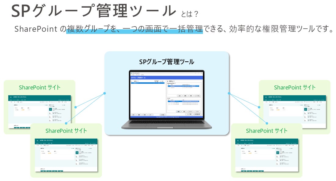 「SPグループ管理ツール」は、SharePointの標準機能では煩雑になりがちな複数グループにおける権限管理の一元化を可能とし、設定作業の効率化・ミス防止・引き継ぎの簡素化など、SharePoint Onlineにおける多くの課題を解決します。