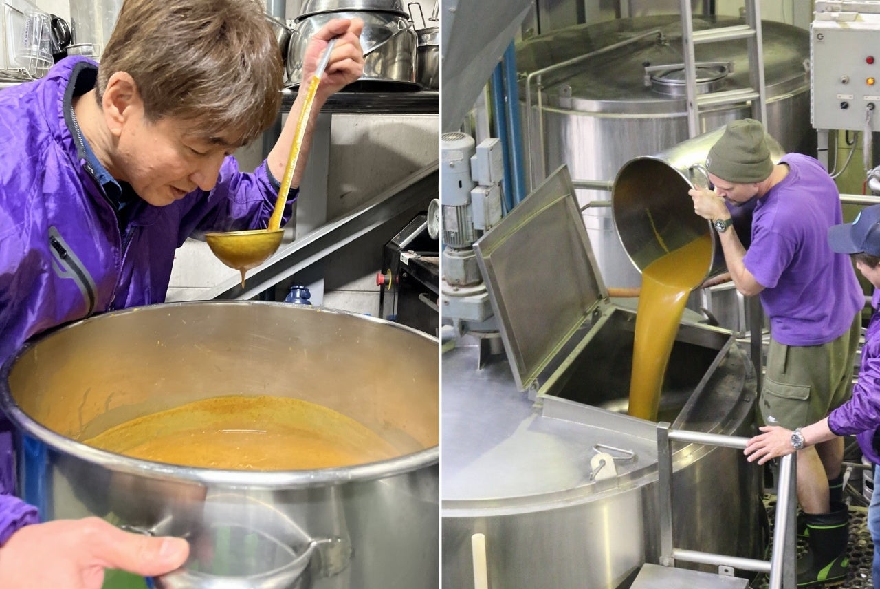 このビールの製造は、大鍋でカレーを作ることから始まりました。つくったカレーは約100Lで、普通に食べると約500人分です。砕いた麦芽とお湯を合わせて麦汁(ばくじゅう)を作る際に、その大鍋で作ったカレーを加えました。