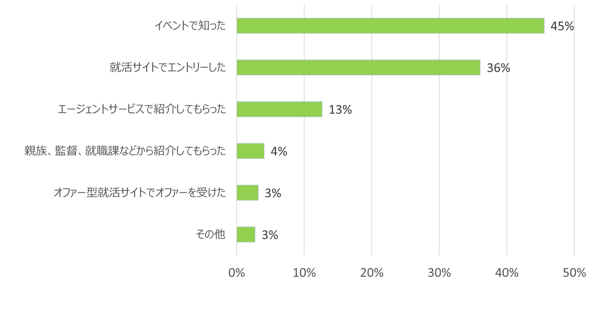 内々定のきっかけとしては【イベントで知った】と回答した学生が最も多く、全体の45%となった。