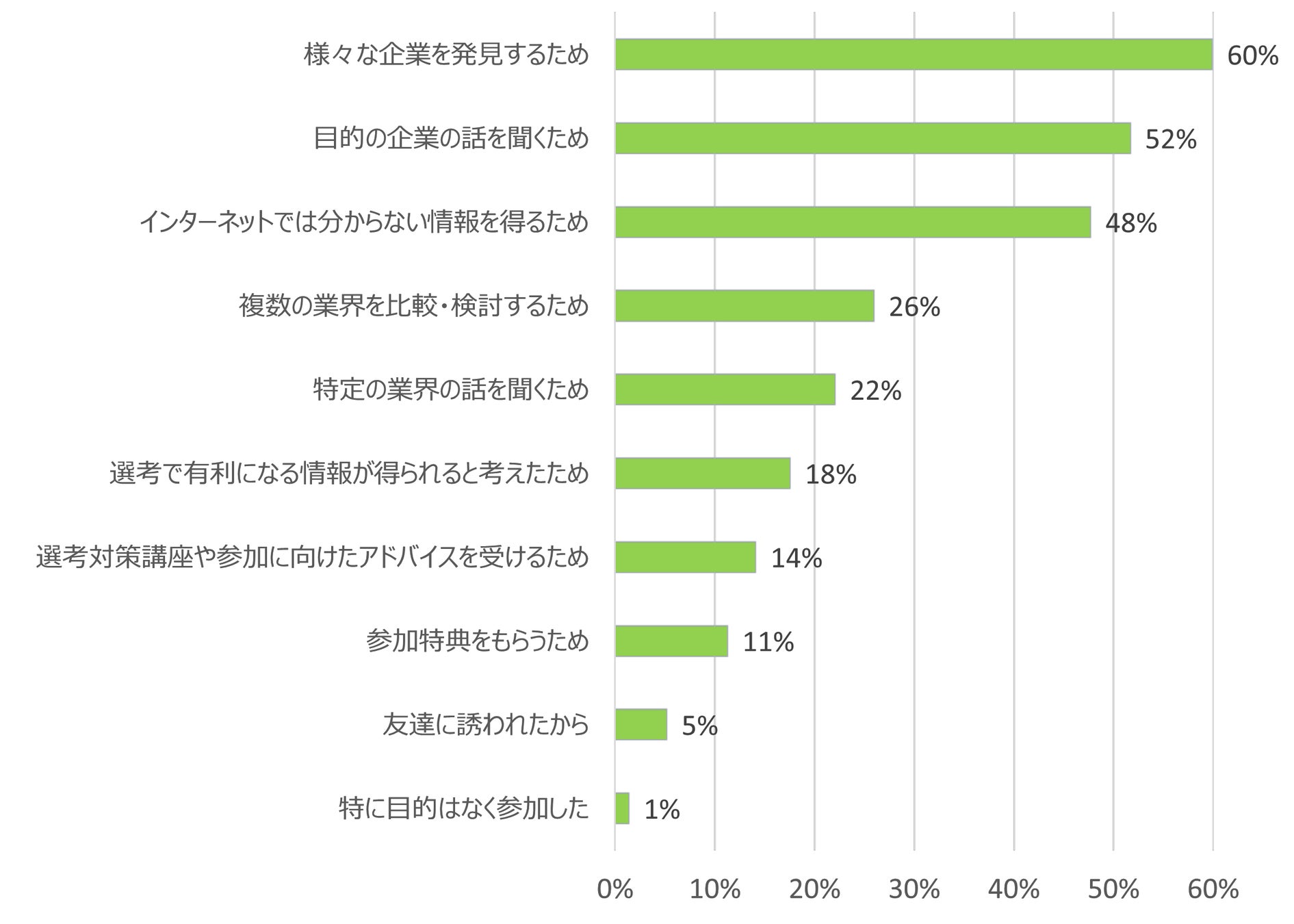 就活イベントの参加目的についての質問では【様々な企業を発見するため】という回答が全体の60%であった。次いで【目的の企業の話を聞くため】という回答が52%となった。