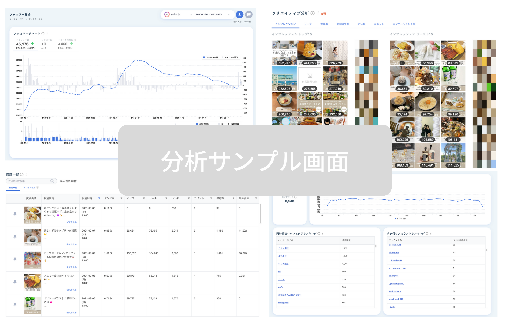・主な分析項目:主要5業界におけるアカウント規模別フォロワー数平均成長率・平均エンゲージメント率・投稿数、主要アカウント最新フォロワー数など