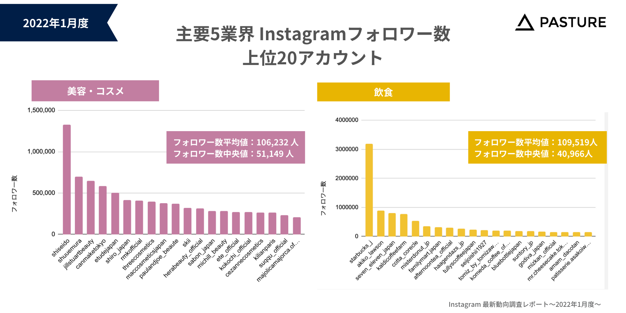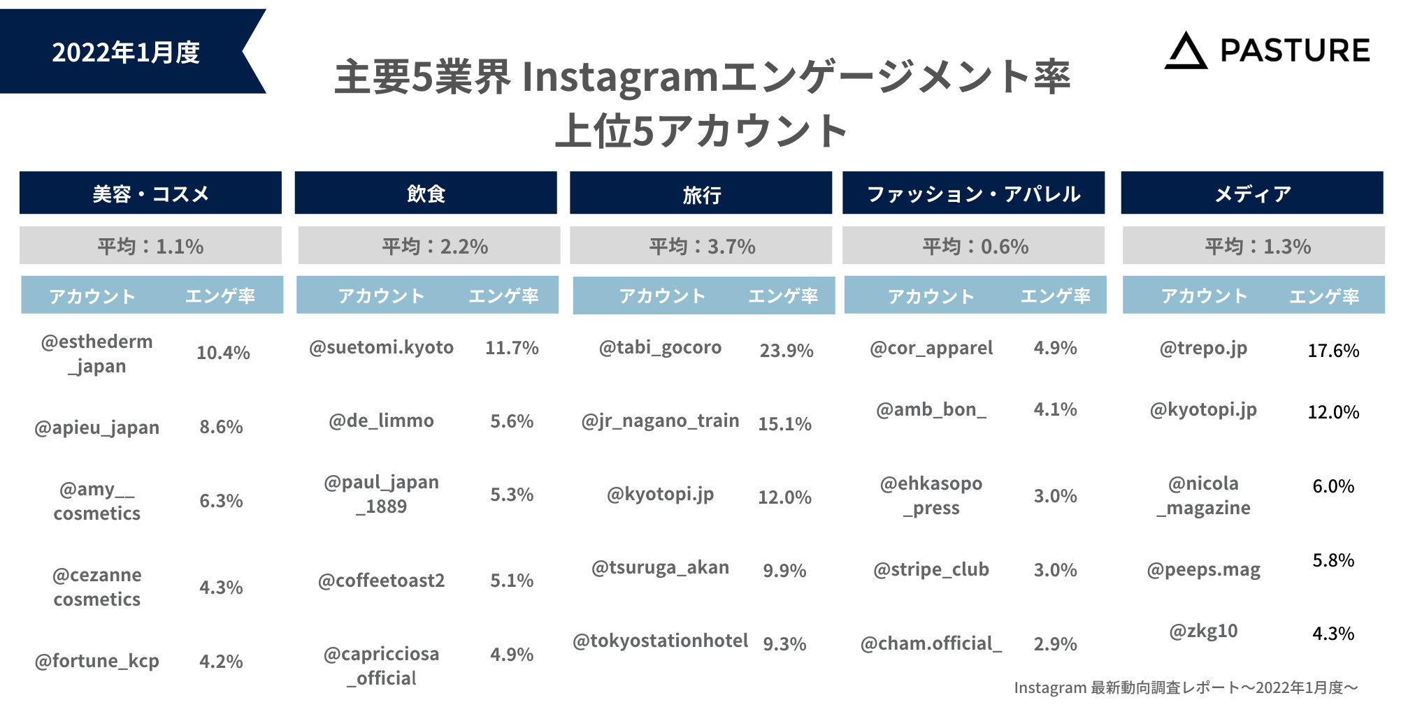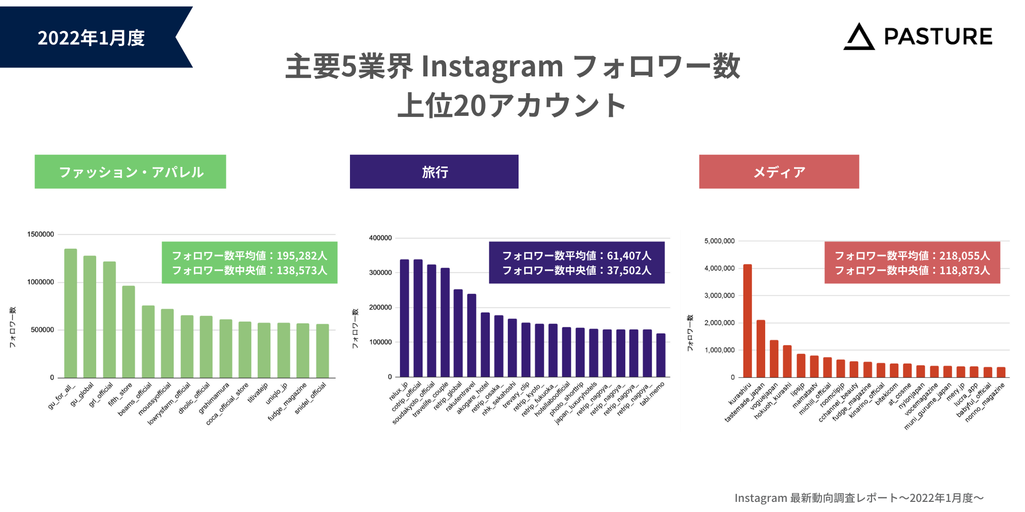 Instagramを中心にSNSマーケティング支援を行う株式会社パスチャー(本社:東京都渋谷区、代表取締役:甲斐 優理子、以下当社)は、企業のマーケティング担当者、Instagram運⽤担当者向けに、美容・コスメ、飲食、ファッション・アパレル、旅行、メディアの主要5業界におけるInstagram動向をまとめたレポート「Instagram最新動向レポート〜2022年1月度〜」を公開しましたのでお知らせいたします。https://mas.ai/dl_contents/