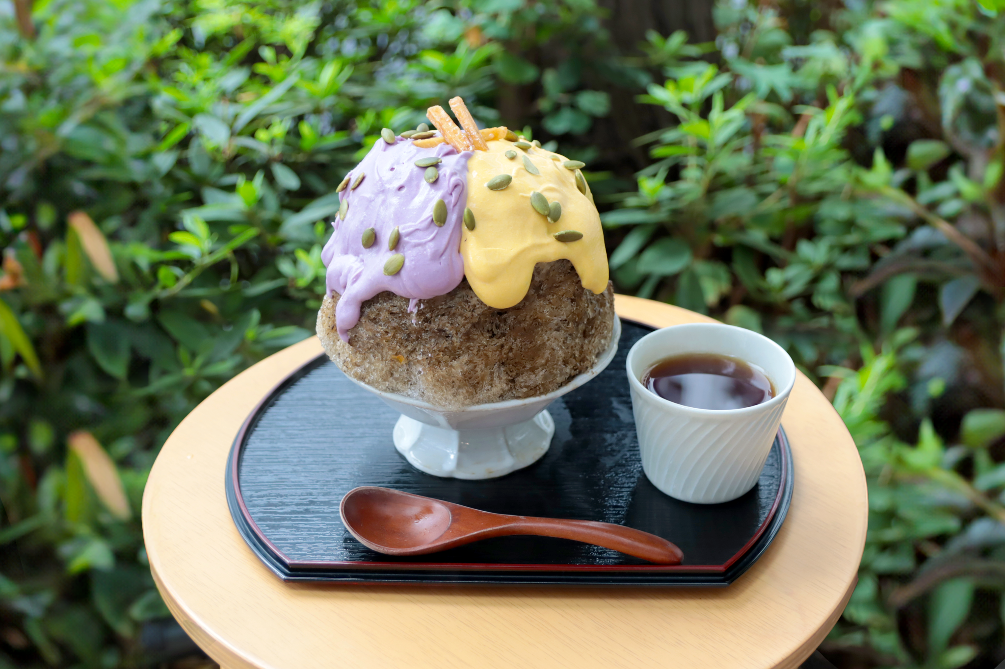 氷の上には、沖縄県産の紅芋を使用した上品な甘さの“紅芋クリーム”と北海道産のかぼちゃを使用した舌触りが滑らかな“かぼちゃクリーム”をたっぷりとかけています。併せて「八屋」の中でも人気のほうじ茶を使用した “ほうじ茶シロップ”をかけて、お茶の香りを存分に楽しみながら味わえるかき氷に仕上げました。