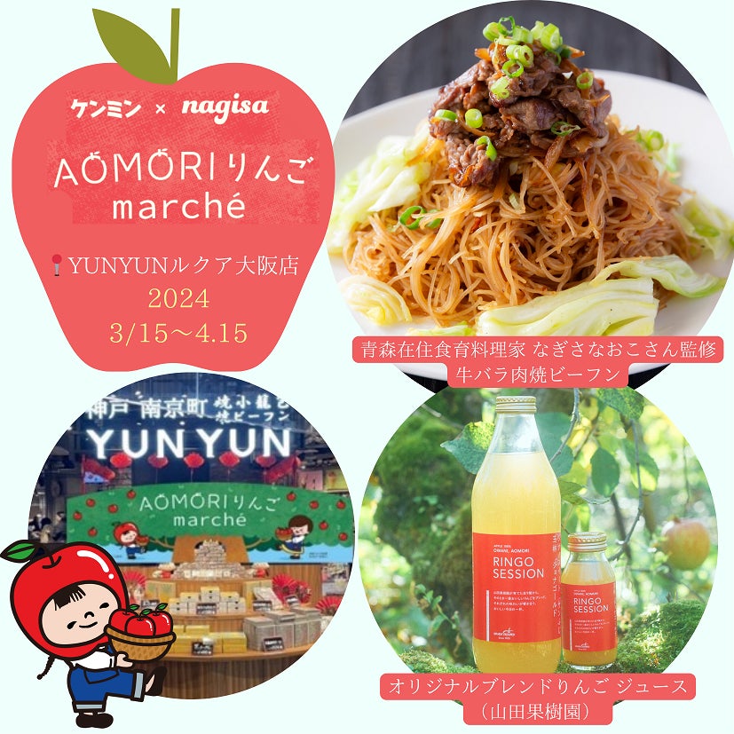 ケンミン食品株式会社(兵庫県神戸市・代表取締役社長:高村祐輝)は、株式会社フードコミュニケーション(青森県八戸市・代表取締役:なぎさなおこ)と協業し、ビーフンと焼小籠包の専門店「YUNYUNルクア大阪店」で「AOMORI りんご marchè」を開催します。