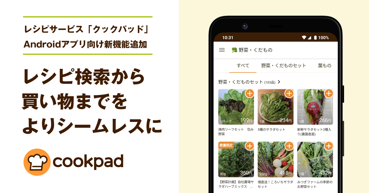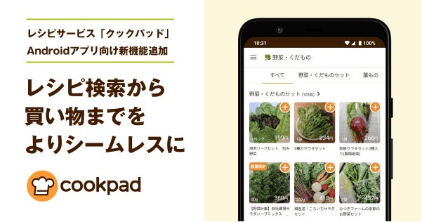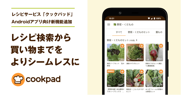 クックパッド株式会社は、料理レシピ投稿・検索サービス「クックパッド」のAndroid版アプリにて、生鮮食品EC「クックパッドマート」の食材を購入できる「買い物機能」を公開しました。本機能を使うことで、ユーザーは、レシピ検索から食材の購入までをワンストップで実行できるとともに、地域の生産者や専門店などのこだわり食材と出会うことが可能になります。