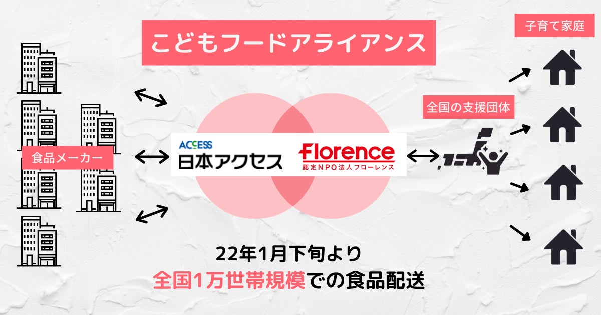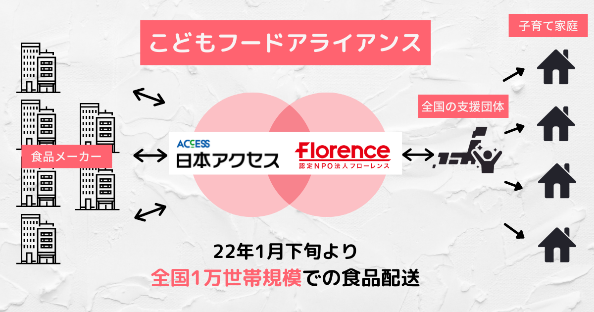 「こどもフードアライアンス」は、国内最大級の食品卸企業である株式会社日本アクセスと協働し、複数の食品メーカーより提供される食品を一括集約し、全国のこども支援団体を通じて子育て家庭に届ける取り組みです。