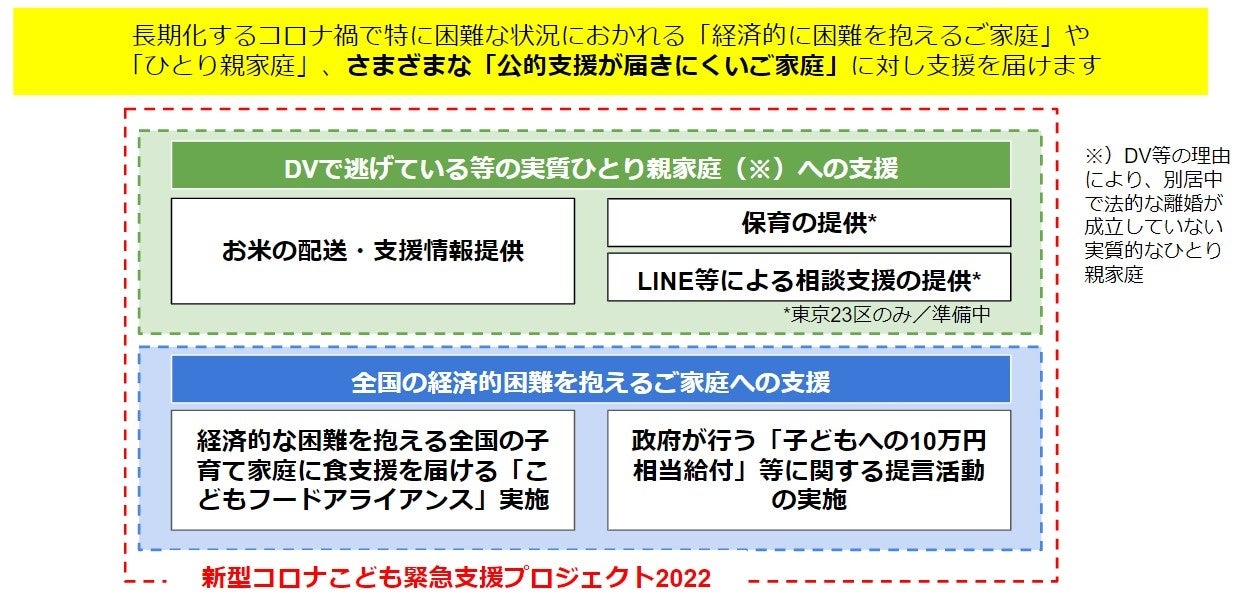 | 【実施中・実施を予定しているプロジェクト内容】 支援対象: 全国の経済的に困難を抱える子育て家庭 ひとり親家庭 DVで逃げている等の実質ひとり親家庭(※) 支援内容: ①経済的な困難を抱える全国の子育て家庭に食支援を届ける「こどもフードアライアンス」実施 ②DVで逃げている等の実質ひとり親家庭(※)に対するお米の配送や支援情報提供 ③DVで逃げている等の実質ひとり親家庭(※)に対する保育やLINE等による相談支援の提供 ④政府が行う「子どもへの10万円相当給付」等に関する提言活動の実施 (※)DV等の理由により、別居中で法的な離婚が成立していない実質的なひとり親家庭 支援期間: 2022年1月~ |