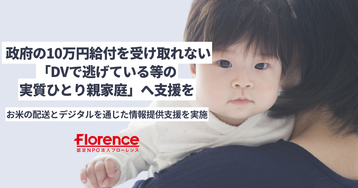 このたび、フローレンスでは、コロナ禍において特に公的な支援が届きにくくリスクの高まる「ノーセーフティネットひとり親家庭」に対し、お米の配送、デジタルによる情報提供などを通じた支援をスタートします。本プロジェクトの立ち上げ資金、支援体制の開発、食品の購入や配送費用については、個人・法人の皆さんからいただく寄付を原資とさせていただきます。