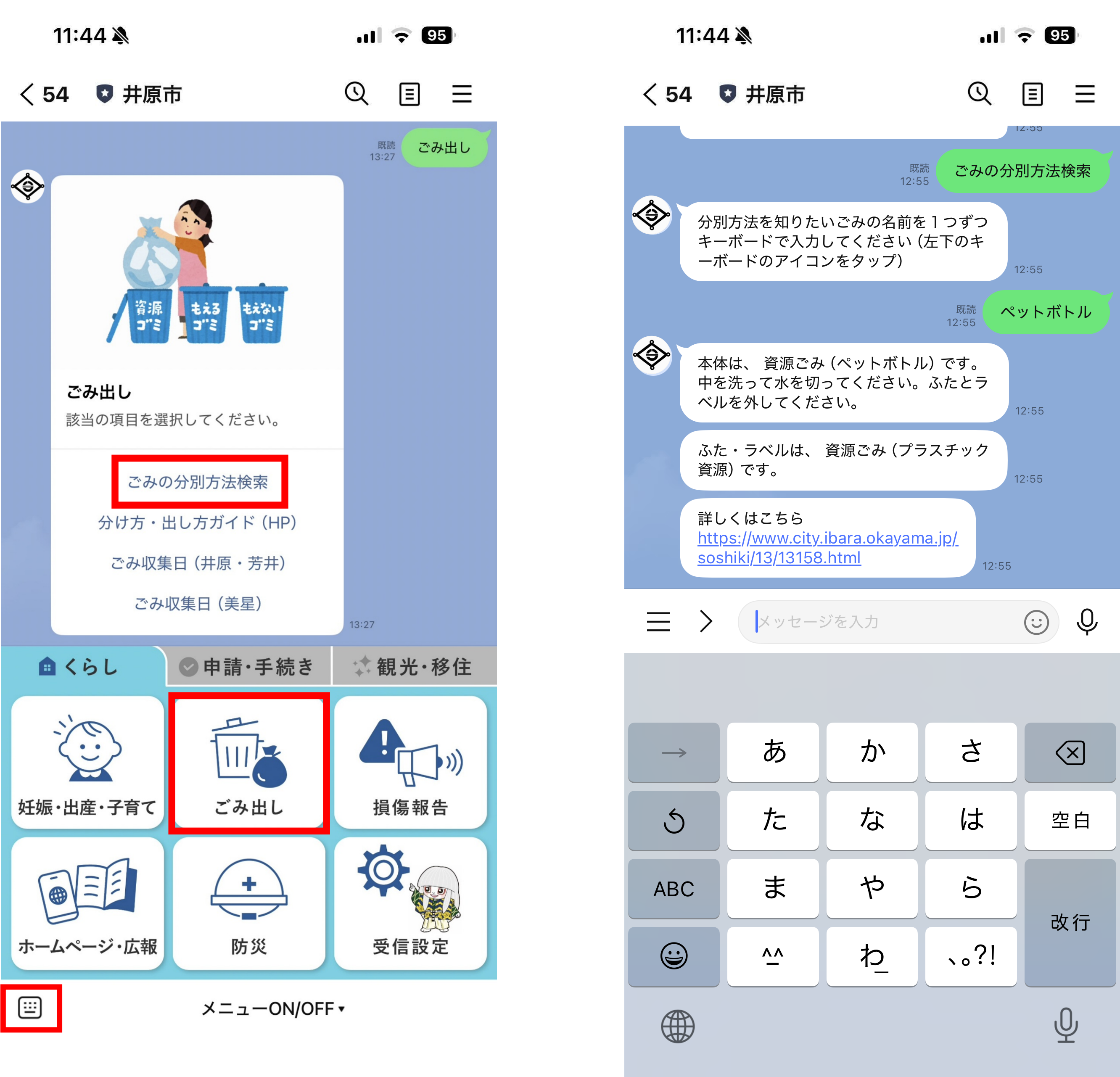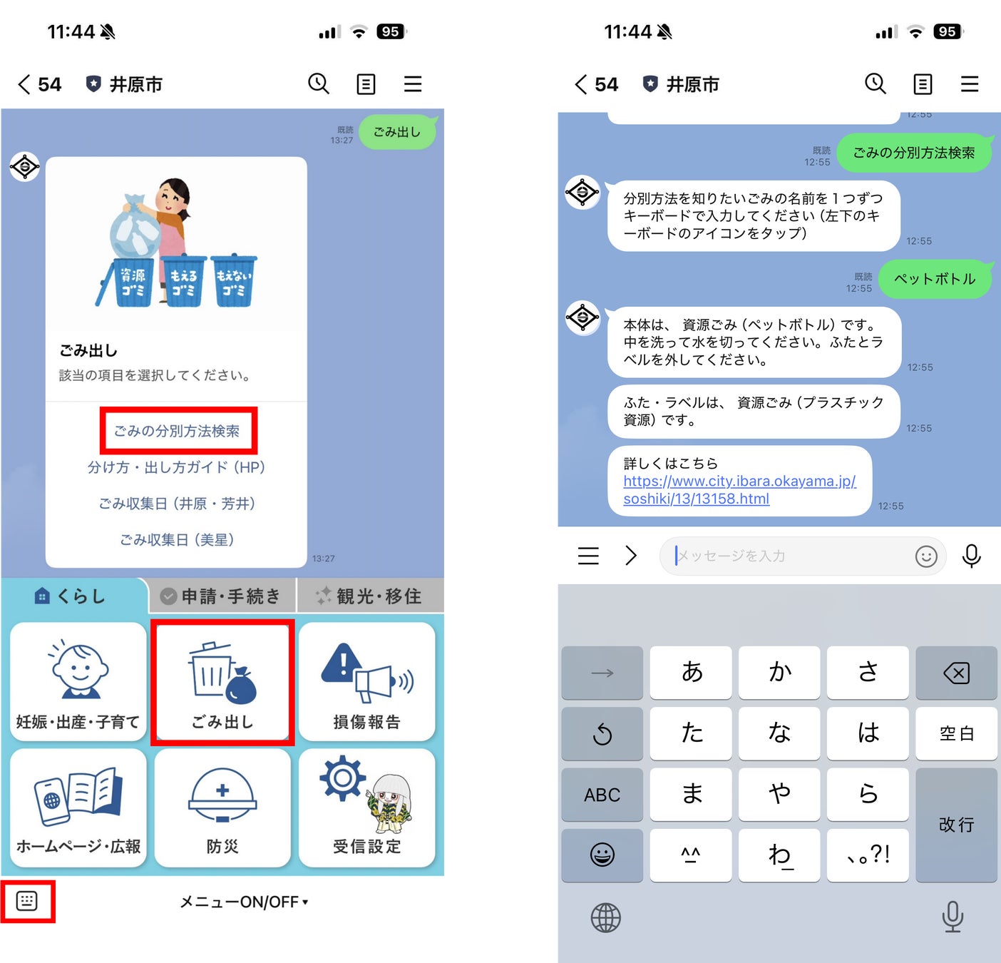 「分別方法を知りたいごみの名前」を送信すると、分別方法が自動返答されます。ごみの分別方法に困った際にも、LINE公式アカウントのチャットボット機能を活用できます。