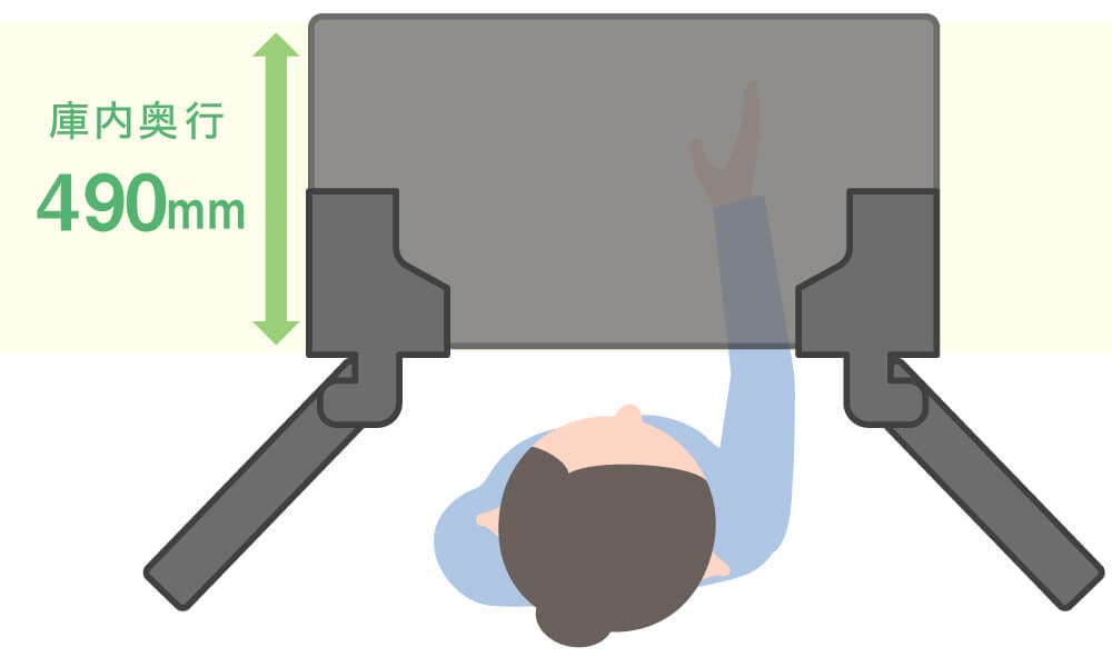 庫内の奥行きは約50cmと薄型のため、奥まで手が届きやすく食材が取り出しやすい仕様です。さらに省スペースで設置できるので、キッチンを広々と使いたい方、食器棚やシンクなど他の家具との並びを綺麗に揃えたい方におすすめです。