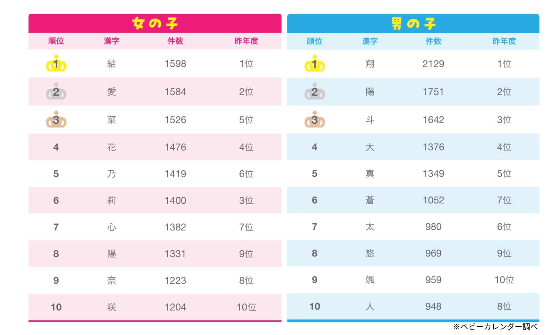 ・【漢字】1位は「翔」「結」。男の子はスケールの大きな漢字、女の子は人との関わりをイメージする愛らしい漢字が人気