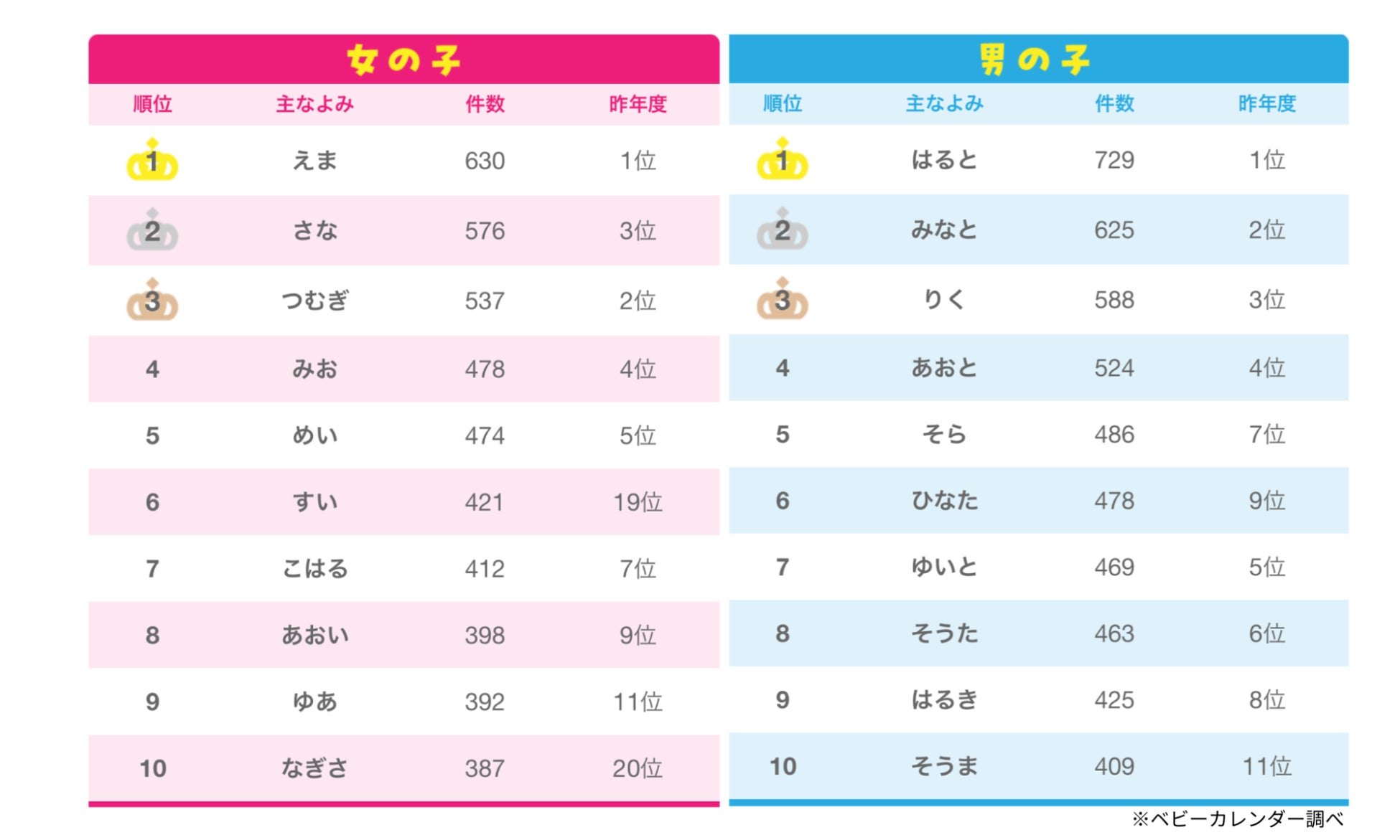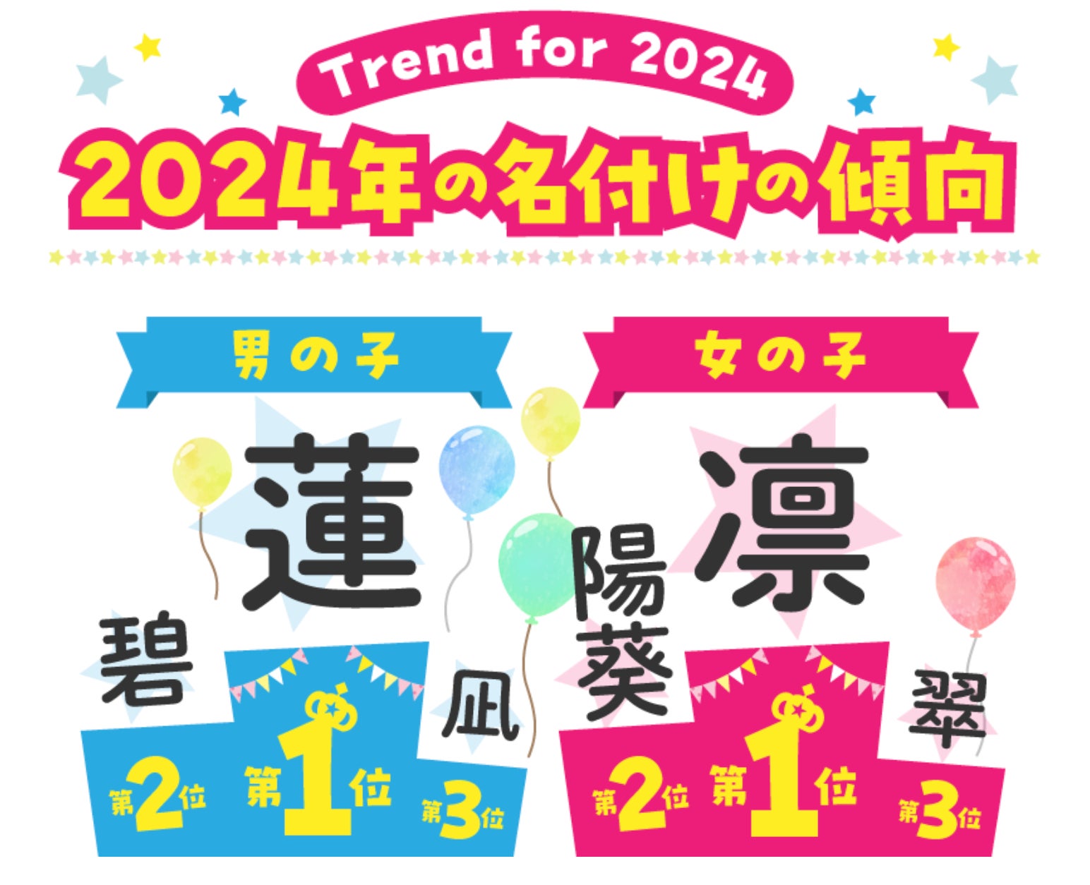 2024年 赤ちゃんの名前ランキング、名前のよみランキング、名前の漢字ランキングをそれぞれ1位〜100位まで発表しています!