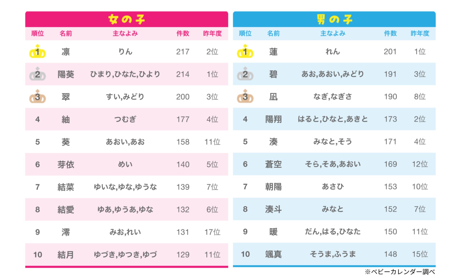 また、漢字ランキングにもジェンダーレスの波がきているよう。男女ともにランキング上位に入っていた「凪」は、男の子の漢字ランキングを見ると2023年の33位から2024年は20位に、女の子の漢字ランキングでも23位から17位へとランクアップしていました。また「翠」も同様に、男の子の漢字ランキングでは100位圏外から96位へ、女の子の漢字ランキングでは56位から45位へと順位を上げていました。