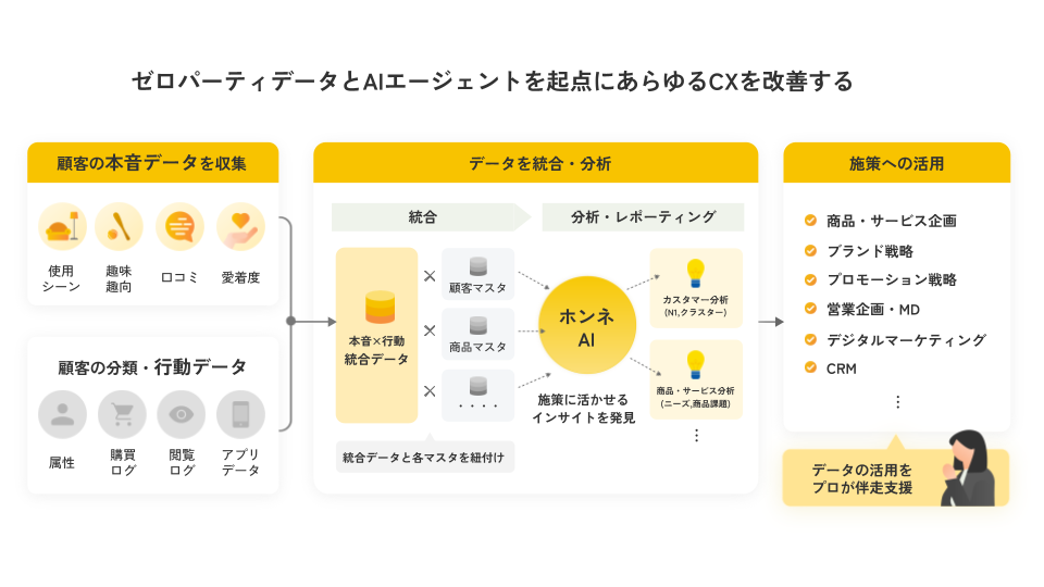デジタル上の行動データだけでは分からない、商品・サービスの利用実態や、行動の背景・感情といった「顧客の本音」を収集・可視化し、商品開発・ブランド戦略・マーケティング効果の最大化を実現します。