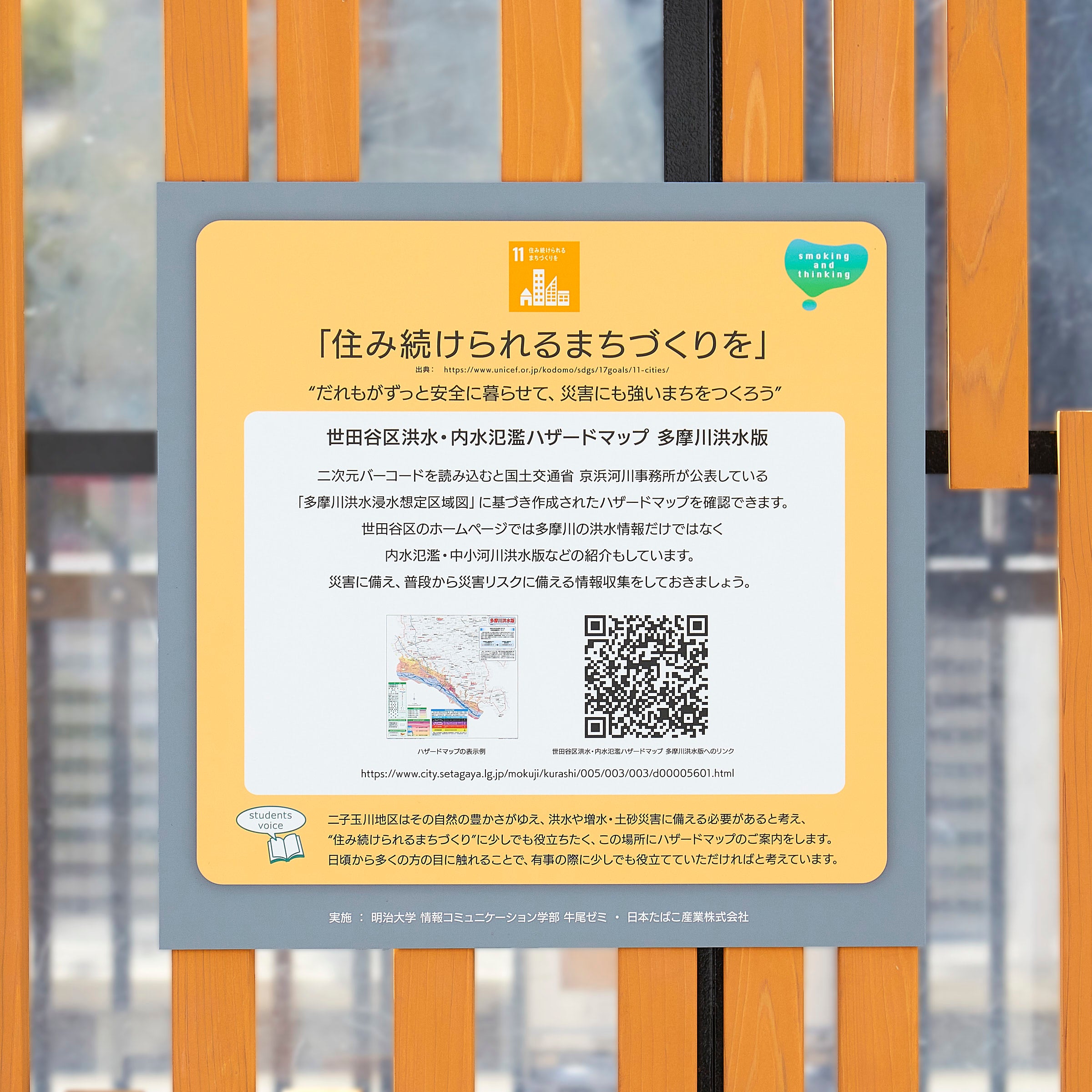 二子玉川駅付近は多摩川をはじめとした自然豊かな地域であることから、洪水や増水・土砂災害に備える必要があると考え、【SDGs目標11:住み続けられるまちづくりを】を発信できるよう「世田谷区洪水・内水氾濫ハザードマップ」を掲示しました。
