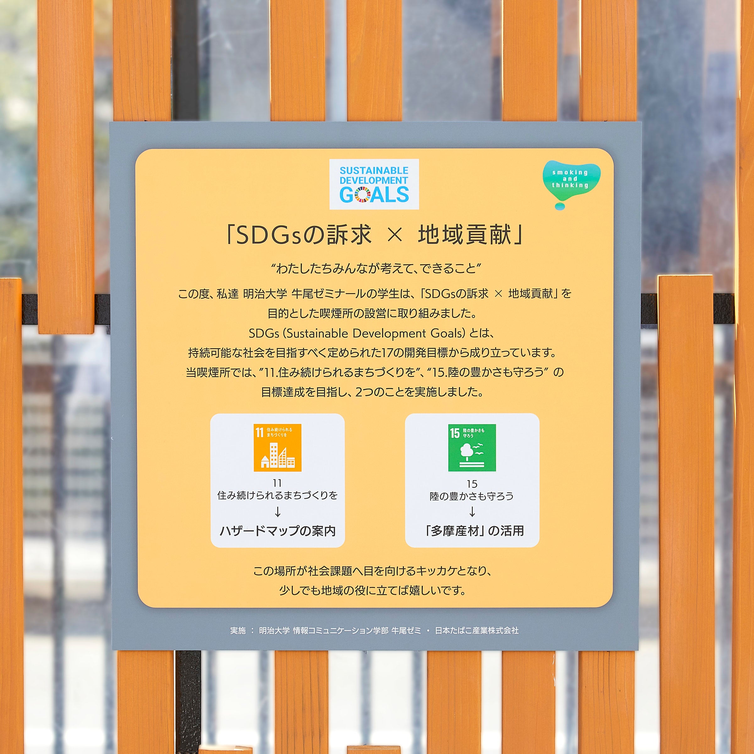 私たちは、喫煙所を「たばこを吸う場所だけではなく考える場所でもあって欲しい」という想いで今回取り組みに参加しました。昨今、SDGsという言葉を耳にすることも増えましたが、「実際はどんなものか分からない」「難しい」などと思う人も多いのではないでしょうか。