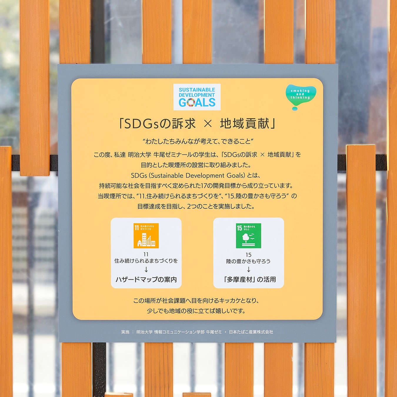 また、今回の取り組みを通して、実際の企業組織や行政機関における意思決定の過程等を体験させていただきましたことは、学生たちにとって何にも代えがたい「生きた学び」につながりました。新たに誕生する本喫煙所がよりよい社会や未来を創造していく皆様の願いを映し出す場として愛されますことを祈念し、関係者各位に心からお礼を申し上げます。