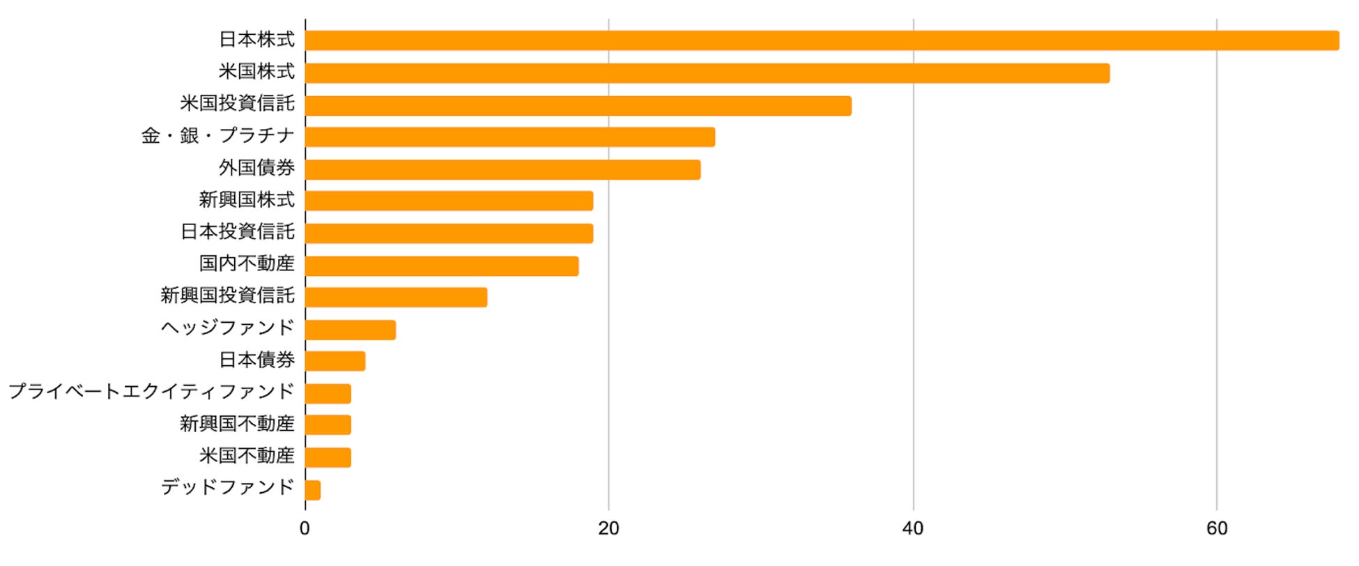 引き続き米国関連の投資は人気が高い状況ですが、割安と思われている日本株式や国内不動産、インフレに強い金・銀・プラチナなどもシェアを占めている状況です。