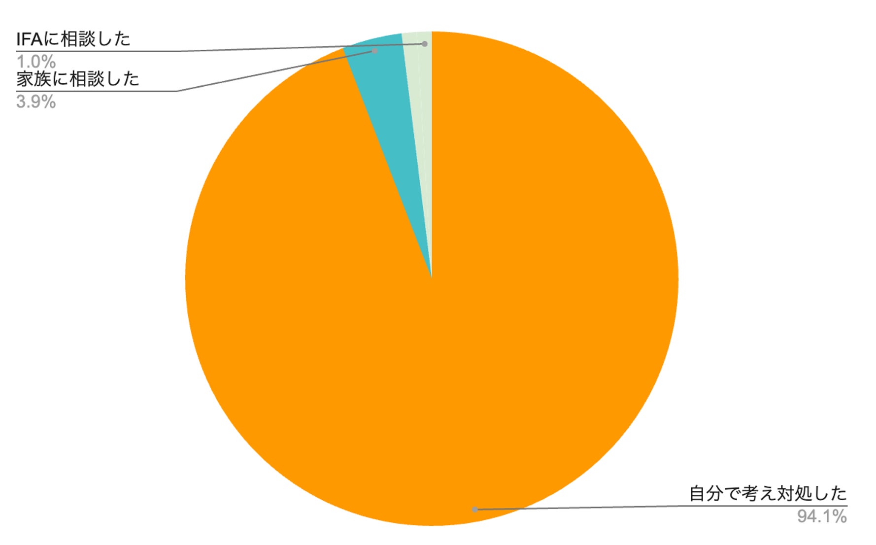 大多数の方が「自分で考え対処した」と回答。「ご自身の運用方針・スタンスを設定しているか」あるいは「焦っても仕方ないと腹を据えたのか」によるものと想定されます。