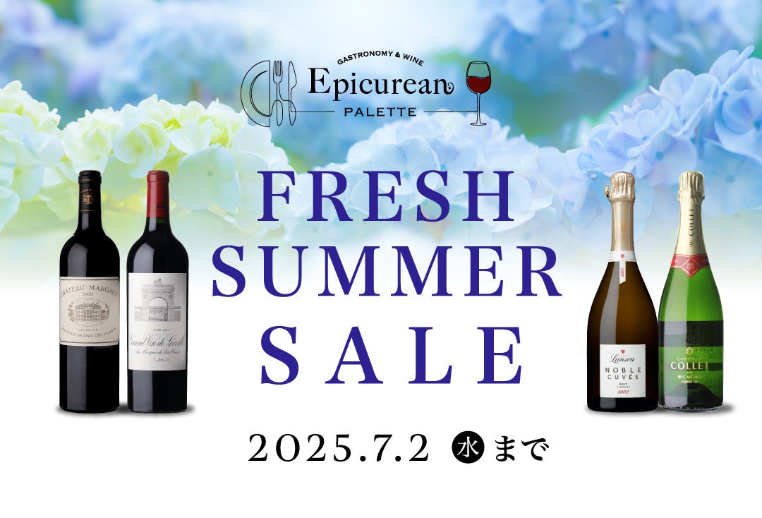 「エピキュリアン・パレット」は、ファインワインを中心としたオンラインショップです。2025年6月19日(木)20時より、梅雨も暑さも吹き飛ばす「フレッシュサマーセール」を開催しております。