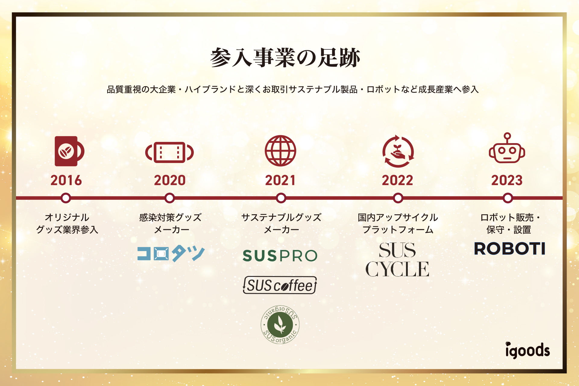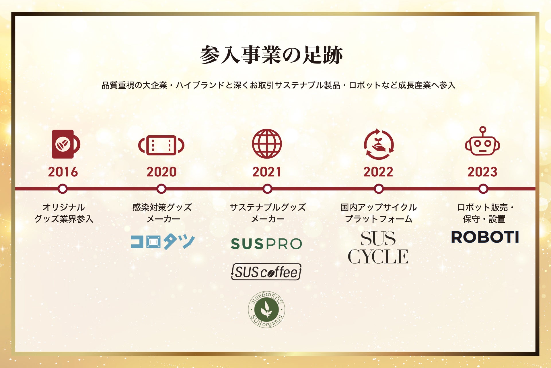 フルオーダーオリジナルグッズの企画生産がコア事業。百貨店外商・アパレル・化粧品・コンサート業界の販売用雑貨、ノベルティや製品用資材を製造してきた当社ですが、コロナウイルスの感染拡大に伴い、創業以来培ってきた輸入・生産管理技術を活用し、2020年2月から業界に先駆けて様々なウイルス対策グッズの製造やグッズ情報を積極的に発信しています。さらには、高まるSDGs需要に対し、企業のサステナブルな取り組みを後押ししたいと考え、サステナブルなOEM事業・SDGsに関する情報発信を開始しました。他にも消費者に直接サステナブルな選択肢を提供したいという思いから、コーヒー粉を再利用した「SUS coffee」ブランドの立ち上げも行っています。このように、社会の要請を敏感に察知し、スピーディーに事業展開を行うことで斜陽化著しいものづくり業界にありながら、安定成長を実現。『アジア太平洋地域の急成長企業ランキング』では、対象企業約100万社以上の中、2021年に総合45位、2022年には総合39位、国内製造業では日本1位にランクインするなど、国内外で高い評価を受けています。