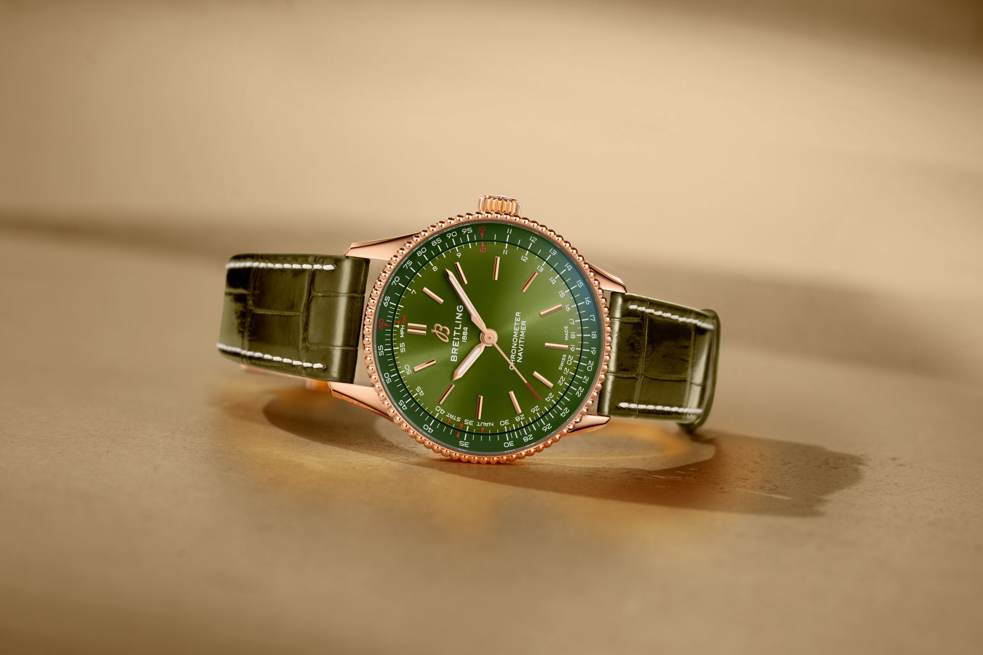ナビタイマー オートマチック 36は、グリーンダイヤルとマッチするカラーの計算尺外周を組み合わせた、統一感のあるワントーンのフェイスに仕上げられています。時刻表示のみの自動巻きブライトリング キャリバー 17を搭載しています。ミッドサイズの36mmケース径は、すっきりとした時刻表示のみのレイアウトで、小ぶりな時計を好む方にとって理想的なバランスを実現しています。このモデルには、文字盤に合わせたグリーンのアリゲーターストラップとレッドゴールド製タンタイプバックルが付いています。
