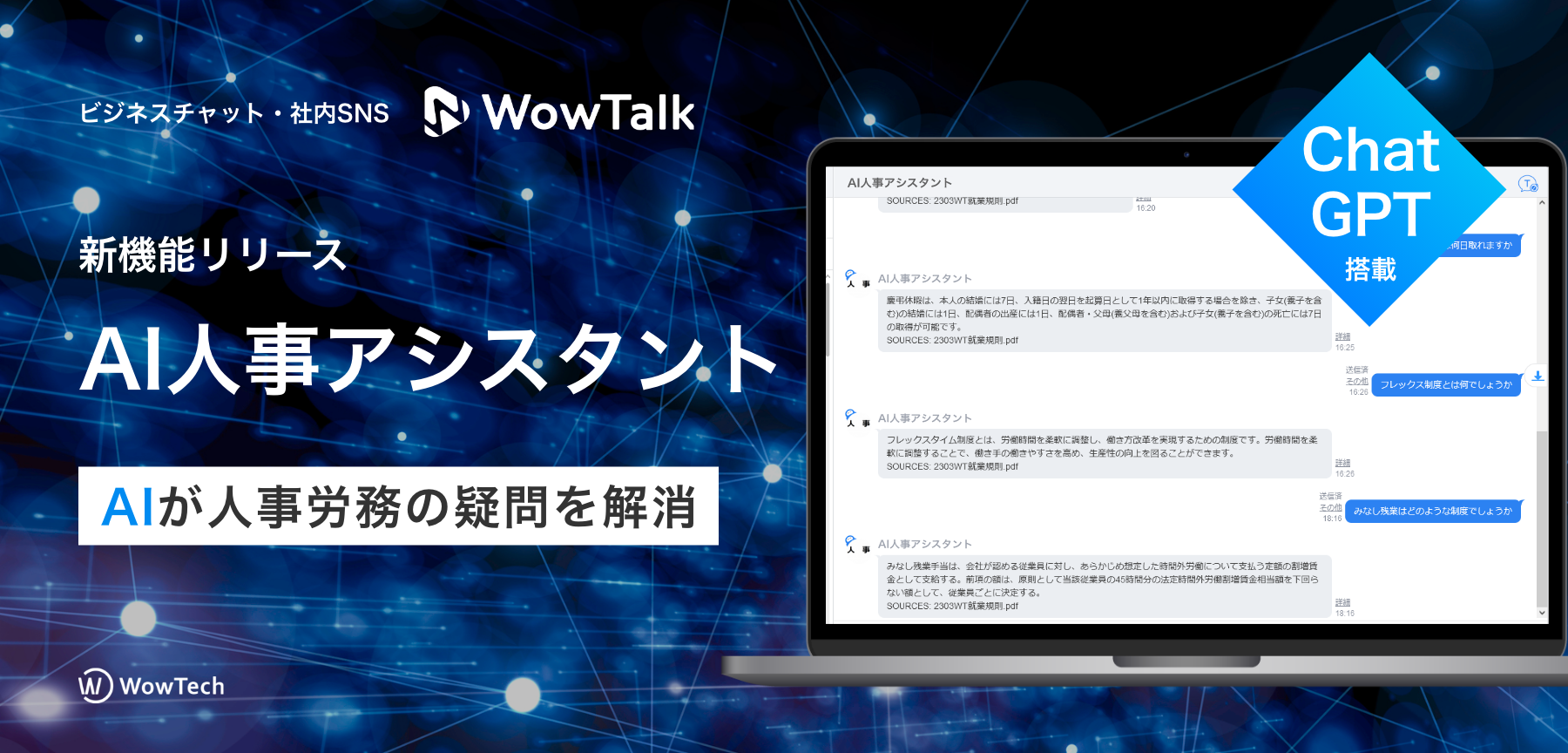 ビジネスチャット「WowTalk」がChatGPTを活用した新機能「AI人事アシスタント」をリリース。AIが社内の人事労務の疑問を解消
