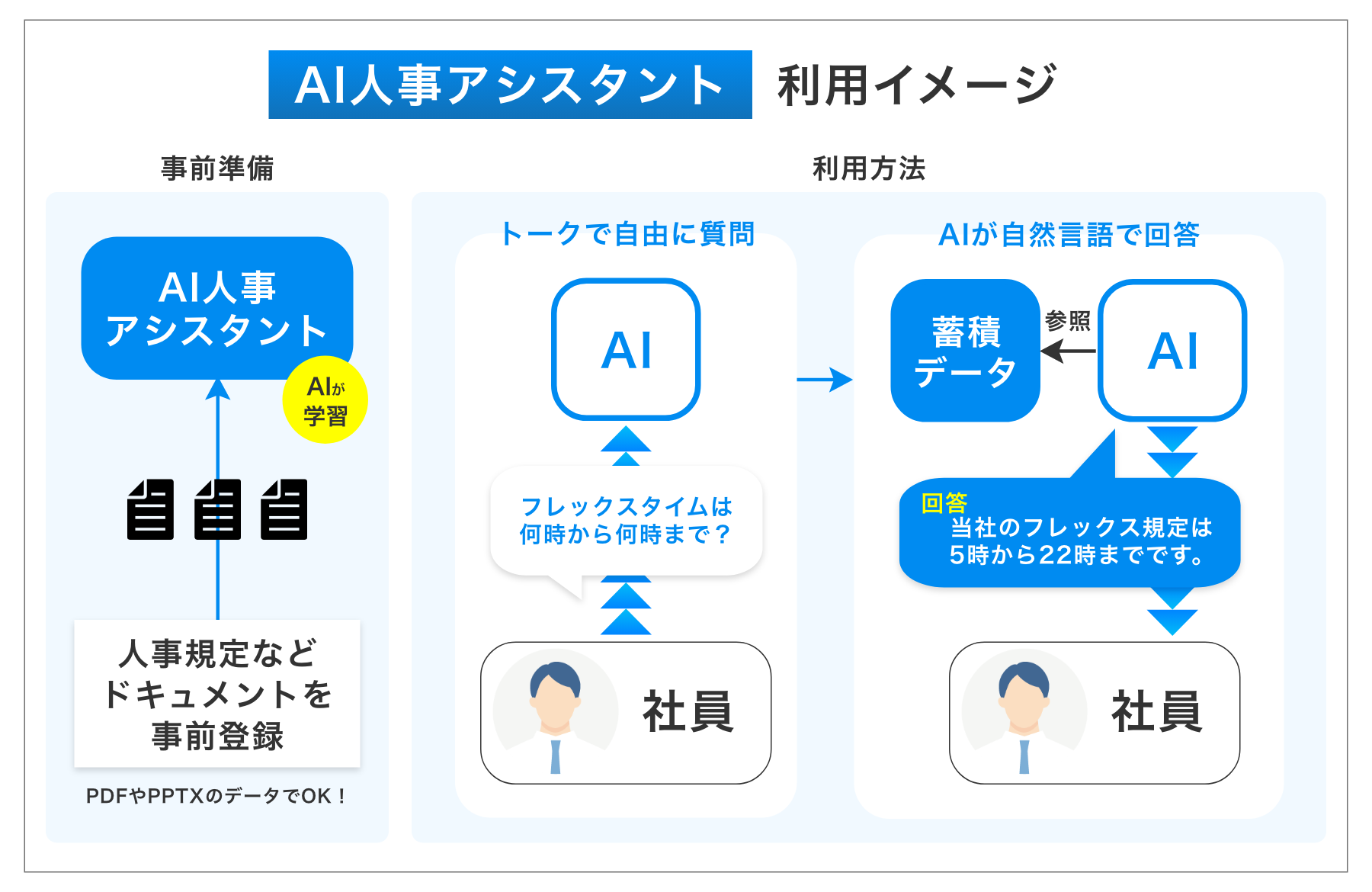 AI人事アシスタントでは、AIが登録されたデータを事前に学習して問い合わせの内容を理解し自然言語で回答を返します。学習させるデータは職務規定や就業規則、人事制度など個社ごとの人事規定に関するドキュメントが登録可能です。AIが個社の人事規定に合わせた適切な回答をすることで、人事担当者の業務負担を低減します。