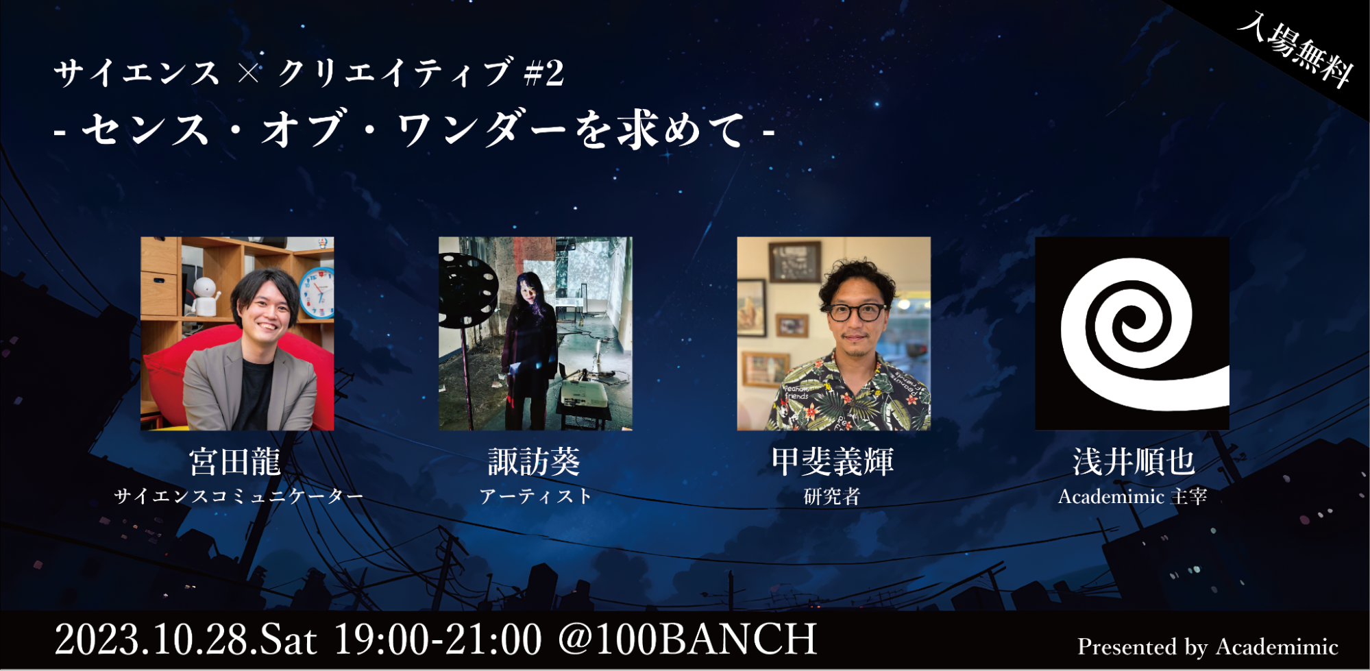 その一環として、10月28日(土)の19時から、サイエンス×クリエイティブの領域に生まれるものの面白さや可能性について探求するトークイベント「センス・オブ・ワンダーを求めて」を開催します。