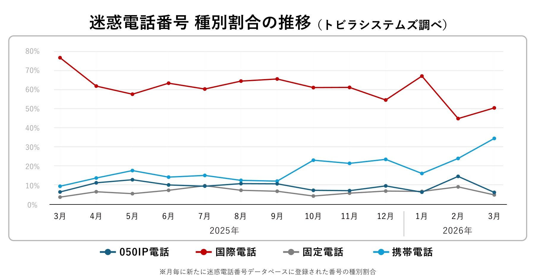 2026年3月に新たにトビラシステムズの迷惑電話番号データベースに登録された番号の種別割合は、国際電話番号が50.5%(前月比+5.6%)、携帯電話番号が34.5%(前月比+10.5%)で、いずれも前月より増加しました。一方で特定IP電話番号(050番号)は6.2%(前月比−8.4%)、固定電話番号が4.9%(前月比−4.2%)と減少しました。