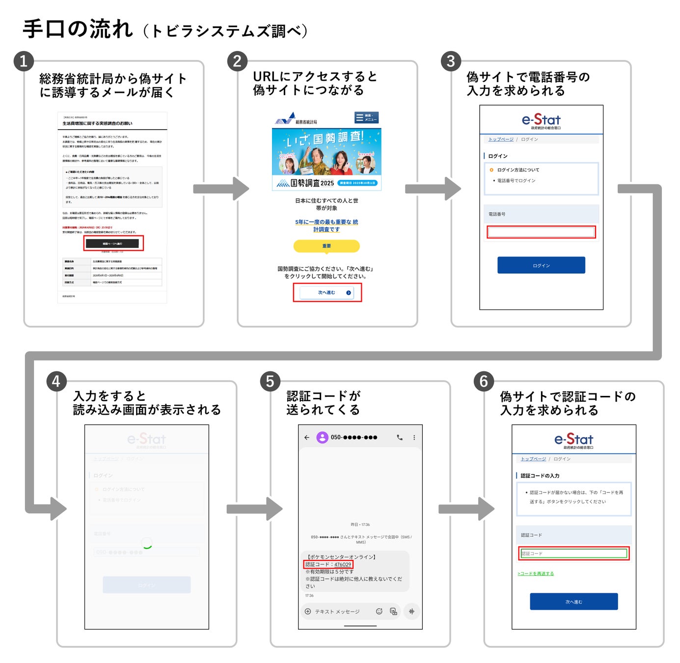 トビラシステムズの調査では、総務省統計局をかたるメッセージから偽サイトへ誘導し、電話番号や認証コードを盗み取る手口が確認されました。