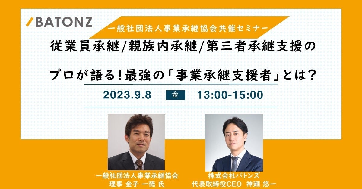 本セミナーは、一般社団法人事業承継協会との共催で事業承継センター株式会社 代表取締役金子氏とバトンズ代表取締役CEO神瀬が登壇し、開催いたします。