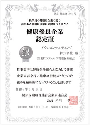 この度、健康経営の推進を目的とした職場環境づくりや、従業員の健康保持・増進に向けた継続的な取り組みが評価され、2026年1月14日付で健康保険組合連合会東京連合会より【健康優良企業「銀の認定」】を取得いたしましたのでお知らせいたします。
