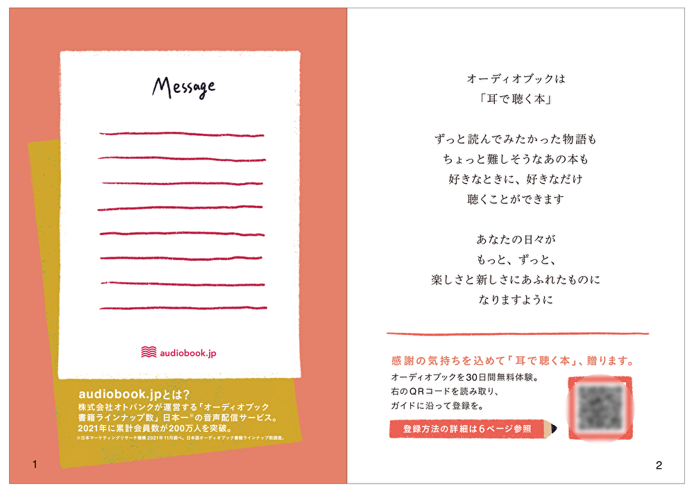 1「オーディオブックとは?」と、日ごろの思いや感謝の気持ちを書き込めるメッセージ欄