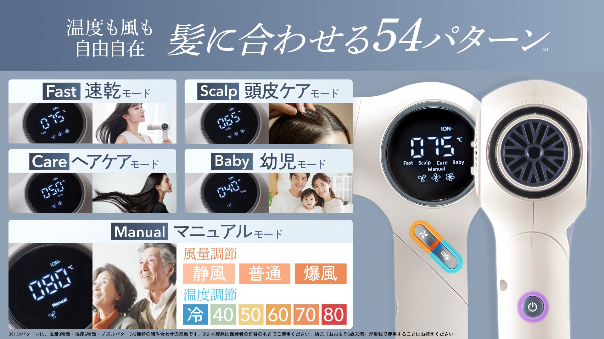 5つのモードに加え、風量は3段階、温度は6段階で調整可能。さまざまな髪質やスタイルに細かく対応できます。ユーザー一人ひとりの好みに合わせた最適なセッティングで、スタイリングの幅も広がります。また、付属の2種類のノズルを使い分けることで、マニュアルモードでは最大54パターンの使い分けが可能。前髪や毛先など、細やかな仕上げも自在に行えます。家族全員が毎日ちょうど良い乾かし方を選べる一台です。
