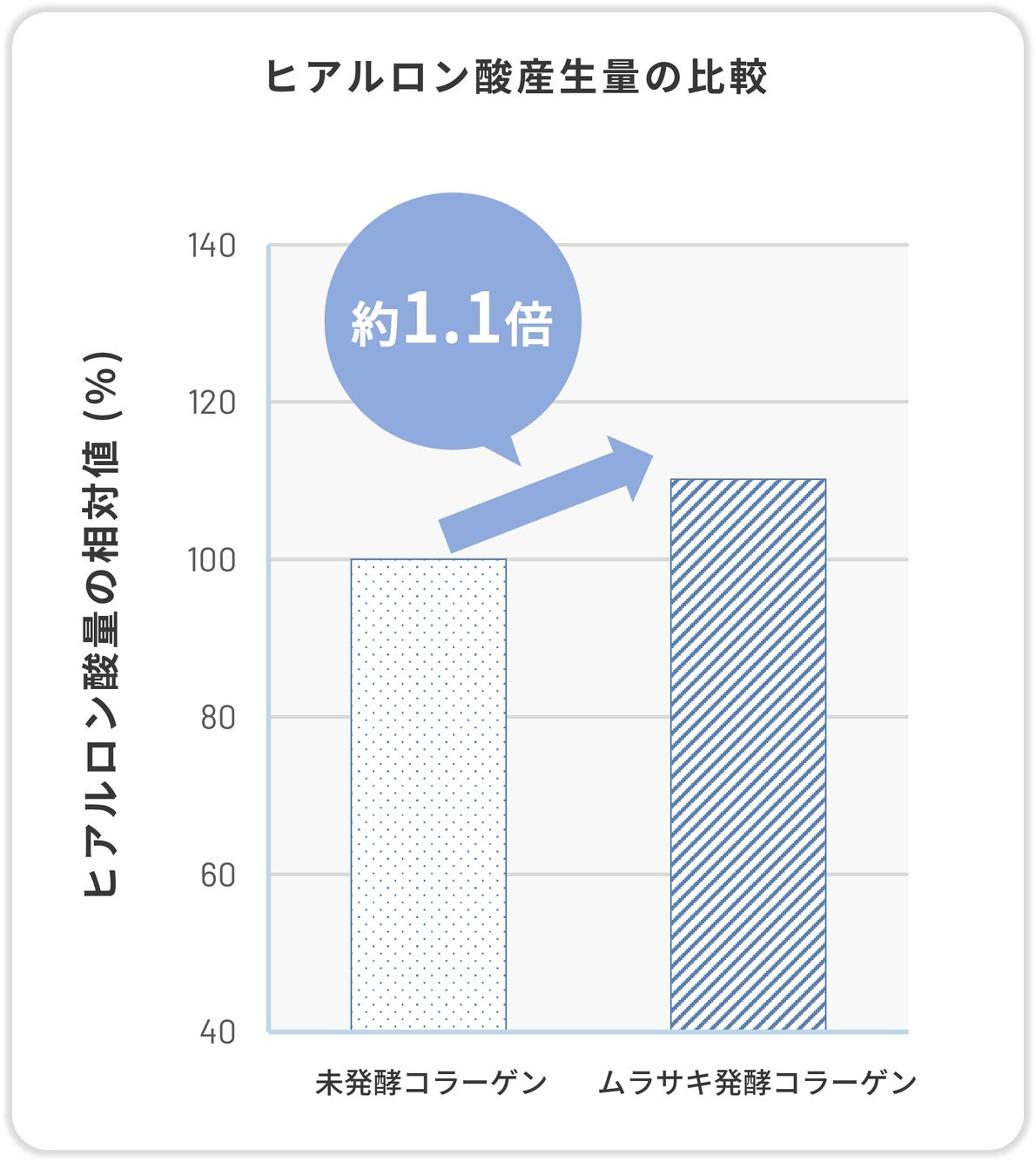 ヒアルロン酸は、肌に水分を蓄えるために重要な成分です。「ムラサキ発酵コラーゲン」は未発酵のコラーゲンと比べてヒアルロン酸産生量が約1.1倍増加し、ヒアルロン酸産生効果が高まることを確認しました。