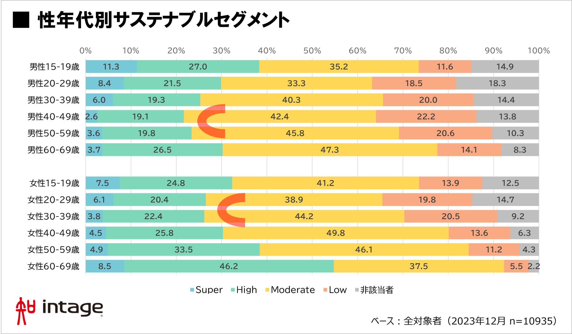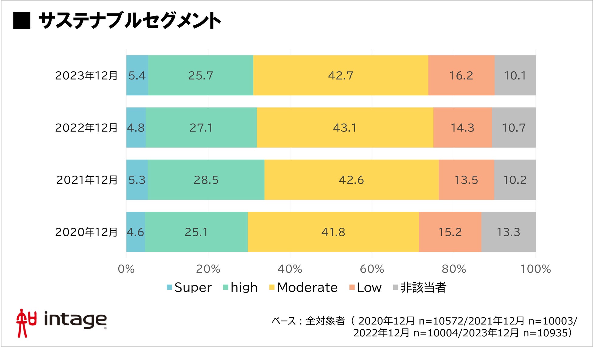 サステナブル度の高いSuper層+High層(以下、「サステナブルアクティブ層」と表記)の割合は、2020年から2021年にかけて増加しましたが、直近の2023年12月調査では、2022年と比較すると0.8ポイントマイナス(31.9%→31.1%)となり、大きな変化はありません。