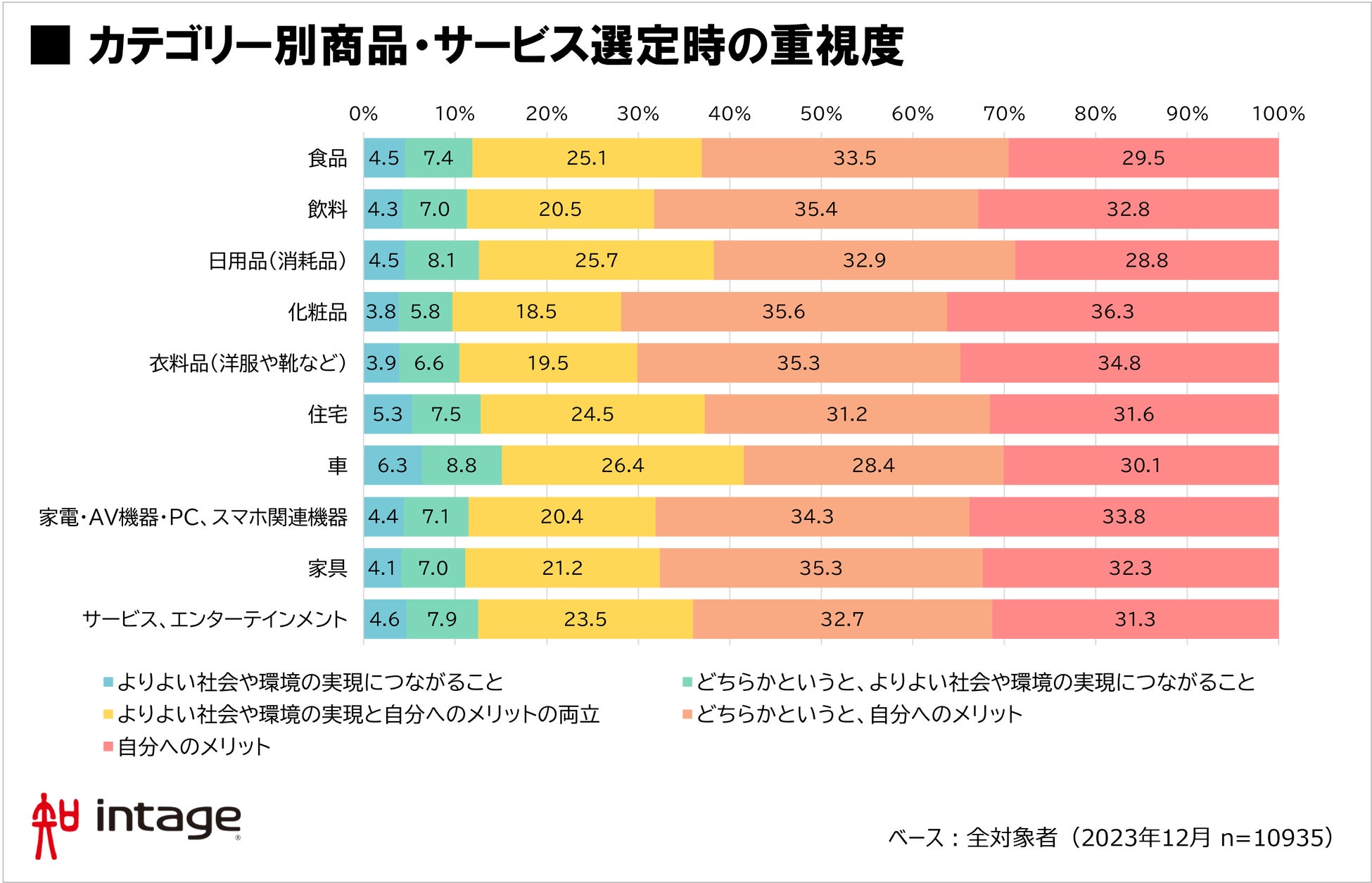この2カテゴリーでは、約4割の生活者が、商品選択において「よりよい社会や環境の実現」を意識していることがわかります。