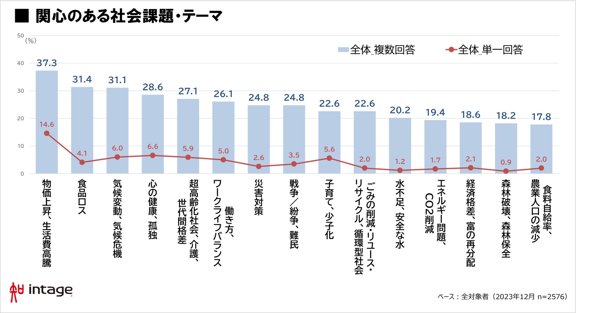 その他の項目に目を向けると、「心の健康・孤独」といった「Well-being」につながるテーマも大きな課題感となっているようです。また、「超高齢化・介護・世代間格差」「子育て・少子化」といった日本が直面する社会課題への関心も高いようです。SDGsといった大きな社会課題に対して認識を深め、日々の取り組みとして定着するためにも、精神的・経済的な安心・安全が担保されることがより大きな社会課題への取り組みにつながるのではないでしょうか。