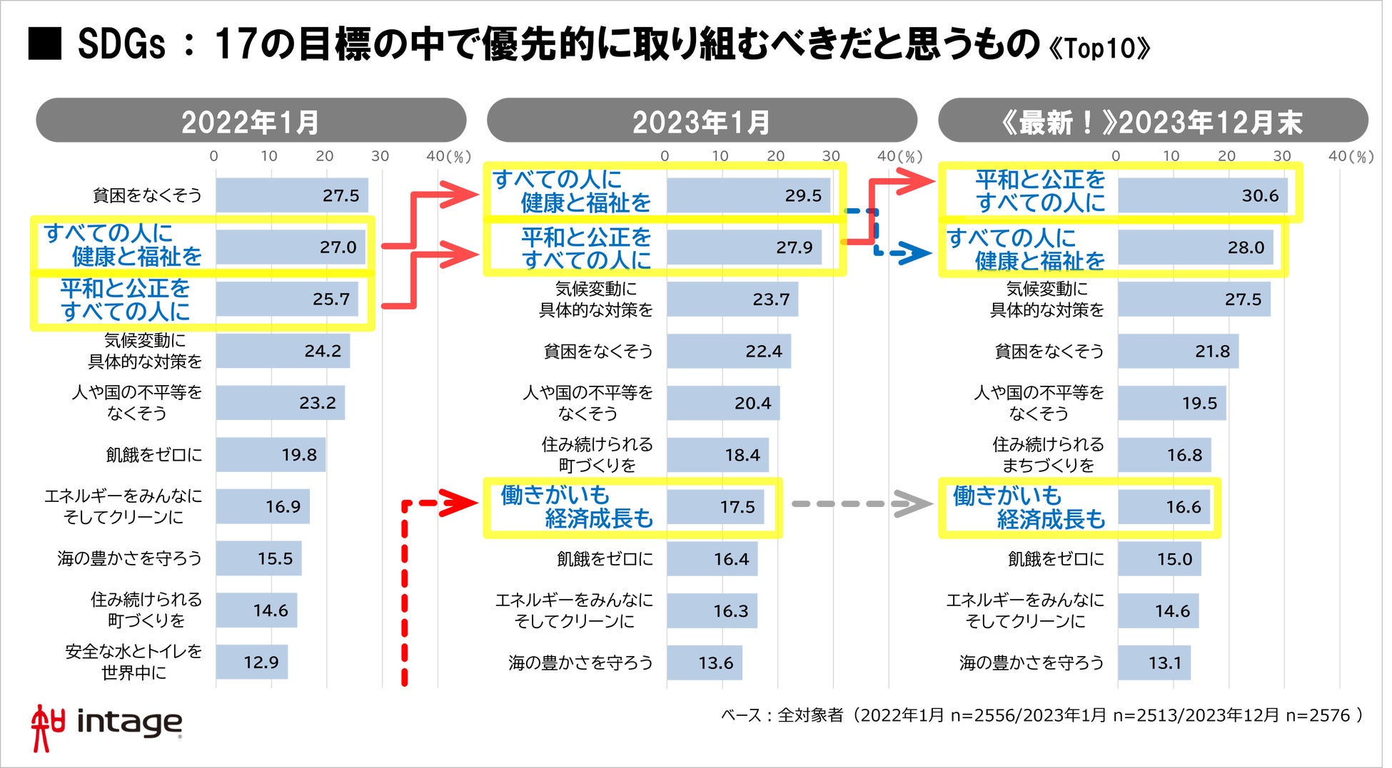 そして、ウクライナ情勢や中東におけるイスラエル・ガザの衝突を目の当たりにしたことも影響してか、最新の結果では「平和と公正をすべての人に」がトップとなりました。過去の動きを振り返ると、3位→2位→1位とこの項目は年々順位を上げてきており、戦争や紛争といった社会不安の影が生活者を色濃く覆いつくしている様子が浮かんできます。