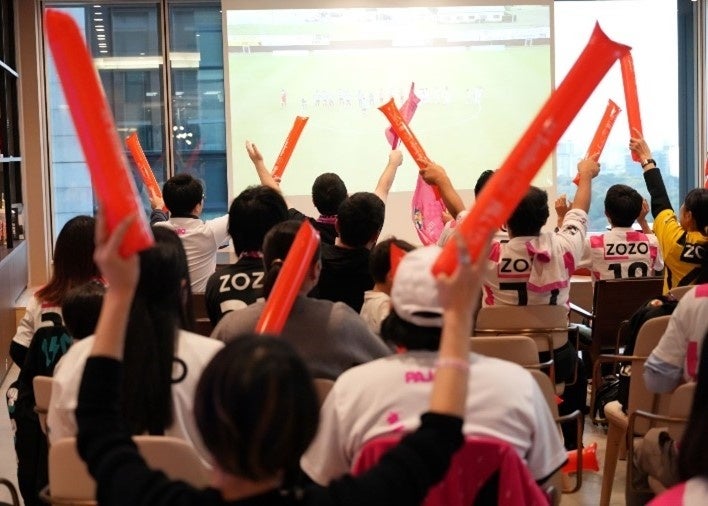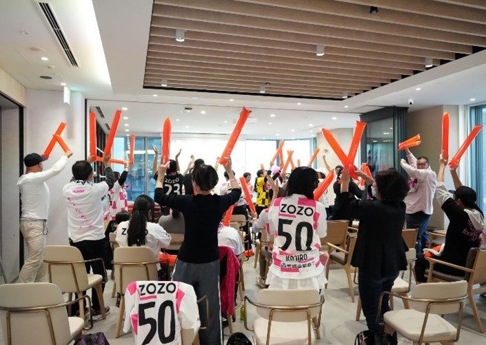 現地では、ホーム最終戦となるこの日、公式マスコットキャラクター(仮称)テゲバわんちゃんがファミリーの皆さまの前に初登場するなど、大変な盛り上がりを見せる中、いちご本社でも14時のキック・オフに向けて、総勢約40名のサポーターの皆さまにお集まりいただき、熱い声援を送りました。