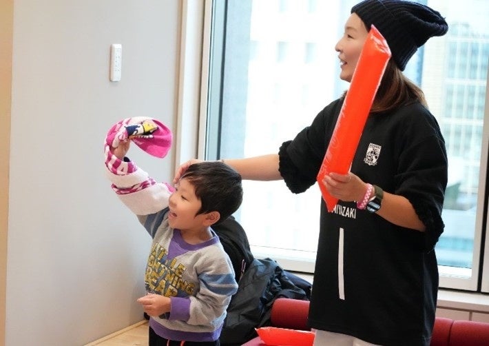 前半2点を先制されたものの、後半で見事に逆転ゴールを決め、いちご本社でも大歓声が沸き起こりました。見事勝利が確定した際には、お決まりの勝利のラインダンスとともに、皆で抑えきれない喜びを分かち合いました。当日は、安田 虎士朗選手のご両親もパブリックビューイングに駆けつけてくださいました。