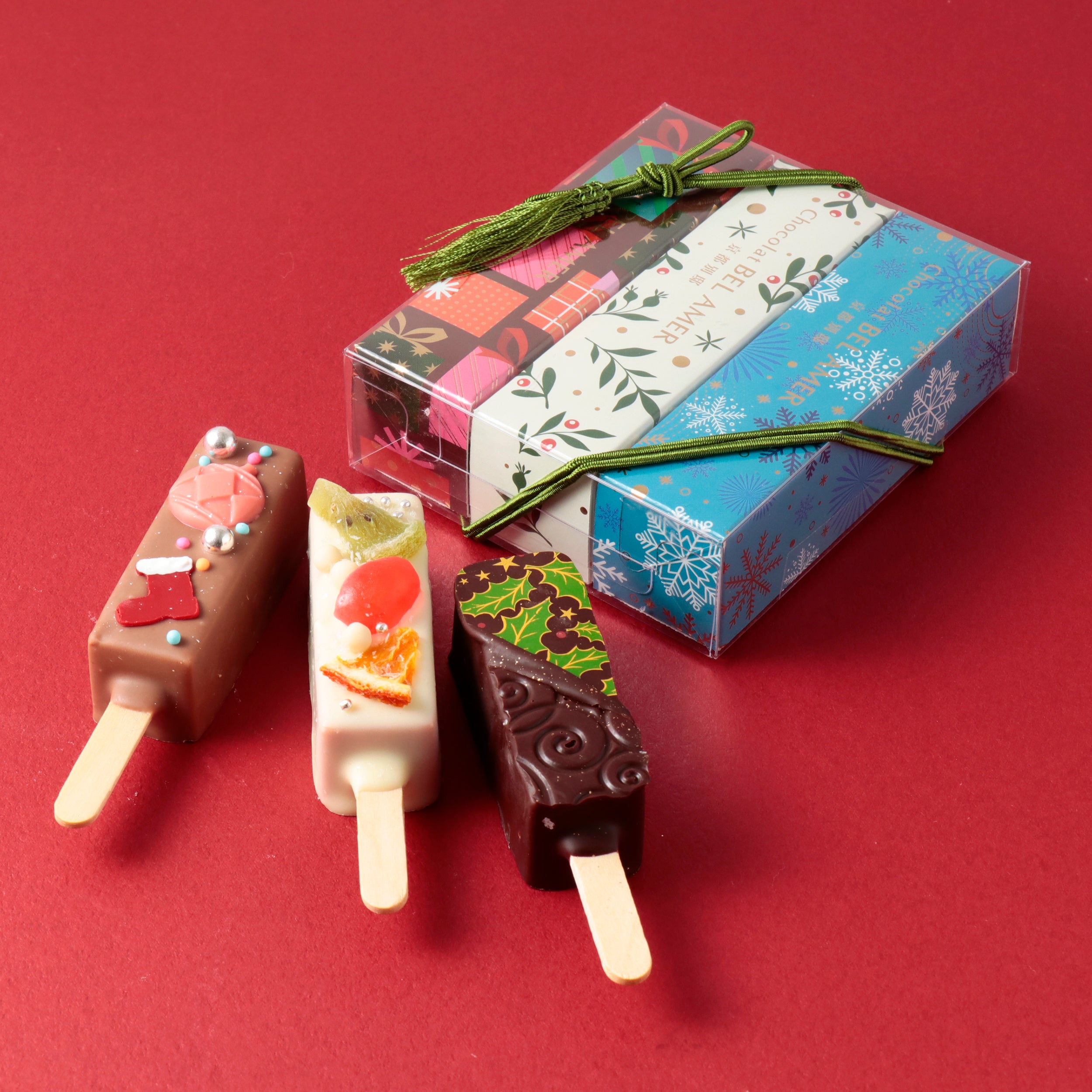 オーナメントや靴下型をモチーフにしたチョコ、ヒイラギの柄で飾ったビターチョコ、様々なフルーツをあしらったチョコなど一層華やかに仕上げました。