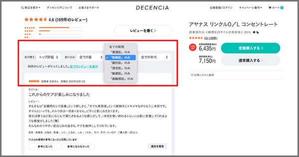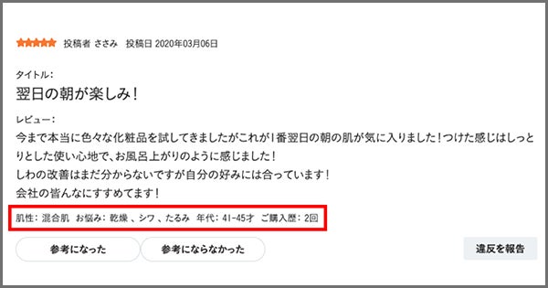 「肌性」「お悩み」「年代」など化粧品購入時に参考となる項目をレビュアー情報に組み込み、購入者にとってより信憑性の高いレビューを提供することが可能です。