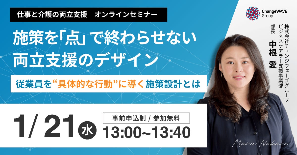 企業の「仕事と介護の両立支援」を行う株式会社チェンジウェーブグループ(本社:東京都港区、代表取締役社長/CEO:佐々木裕子)は、2026年1月21日(水)に無料オンラインセミナー「施策を「点」で終わらせない両立支援のデザイン〜従業員を“具体的な行動に導く”施策設計とは~」を開催いたします。