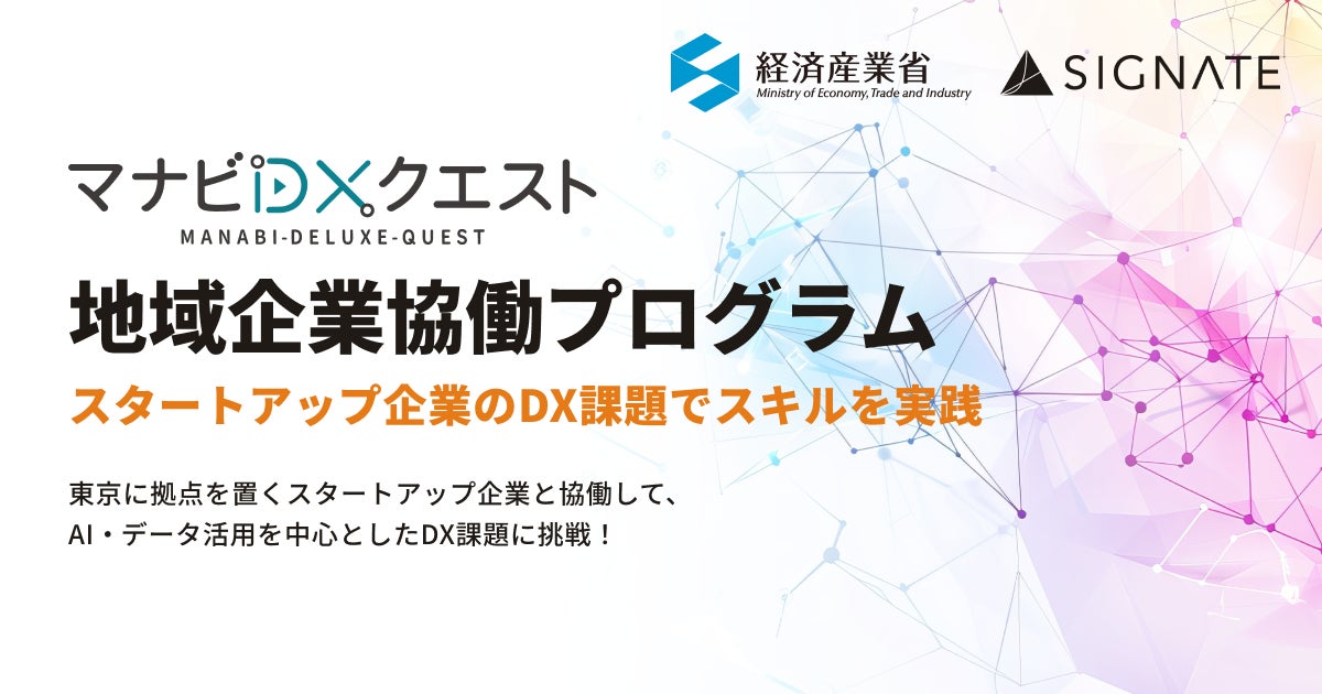 企業のDXを支援する株式会社SIGNATE(本社:東京都港区、代表取締役社長:齊藤 秀、読み方:シグネイト、以下 SIGNATE)は、経済産業省の委託事業であるデジタル人材育成事業「マナビDX Quest」において、ケーススタディ教育プログラム及び地域企業協働プログラムを提供しました。