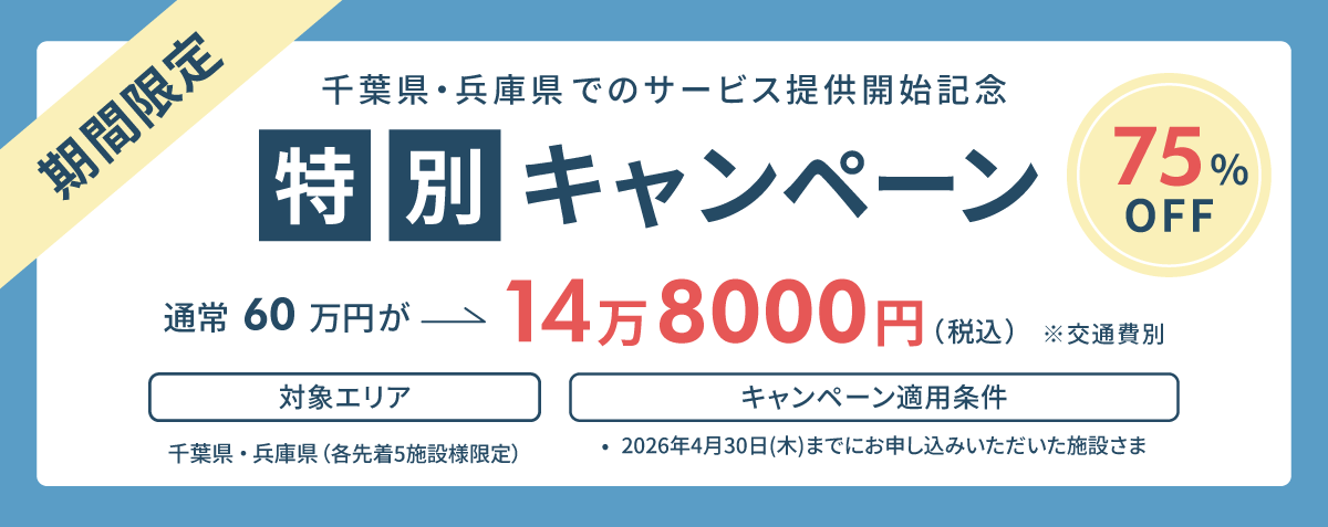 千葉県・兵庫県の施設様、先着5施設限定で、通常の75%OFFにあたる「14万8000円(税込)」で第三者評価を実施します。